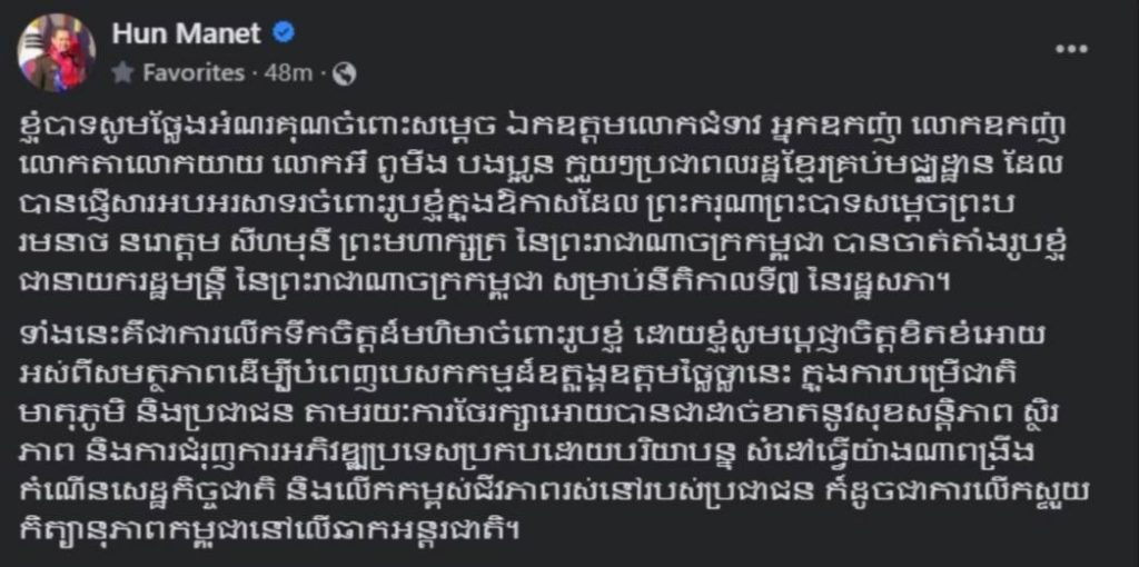 ភ្នំពេញ៖ ឯកឧត្តម បណ្ឌិត ហ៊ុន ម៉ាណែត បានប្ដេជ្ញាចិត្តបម្រើជាតិ មាតុភូមិ និងប្រជាជន អស់ពីសមត្ថភាព ក្នុងតួនាទីជានាយករដ្ឋមន្ត្រីកម្ពុជា។ បណ្ឌិត ហ៊ុន ម៉ាណែត ដែលទើបតែត្រូវបានព្រះមហាក្សត្រ ត្រាស់បង្គាប់ចាត់តាំងជានាយករដ្ឋមន្ត្រី ដើម្បីបង្កើតគណៈរដ្ឋមន្ត្រី អាណត្តិទី៧ នៃរដ្ឋសភា បានបង្ហោះប្ដេជ្ញាដូច្នេះនៅលើបណ្ដាញទំនាក់ទំនងសង្គមនៅព្រឹកថ្ងៃទី៨ ខែសីហា ឆ្នាំ២០២៣ ។