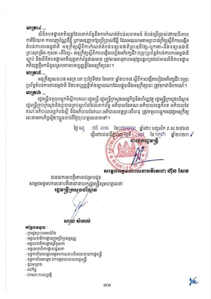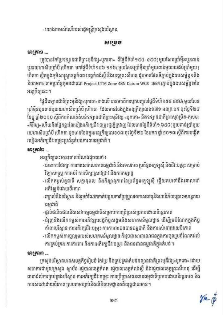 ក្នុងអនុក្រឹត្យនេះបានបញ្ជាក់ថា ក្រសួងបរិស្ថាន មានសមត្ថកិច្ចរៀបចំកែប្រែ និងគ្រប់គ្រងតំបន់ឧទ្យានជាតិព្រះមុនីវង្ស«បូកគោ» ដោយ សហការជាមួយក្រសួង ស្ថាប័ន រដ្ឋបាលខេត្តកំពត រដ្ឋបាលខេត្តកំពង់ស្ពឺ និងរដ្ឋបាលខេត្តព្រះសីហនុ ដើម្បីធានាដល់ការគ្រប់គ្រងបរិស្ថាន ការអភិរក្សជីវៈចម្រុះ ការប្រើប្រាស់ធនធានធម្មជាតិប្រកបដោយនិរន្តរភាព និង ការរស់នៅដោយចីរភាព ស្របតាមច្បាប់និងលិខិតបទដ្ឋានគតិយុត្តជាធរមាន ៕ដោយ វណ្ណលុក