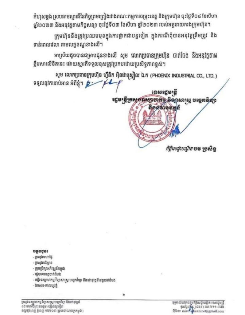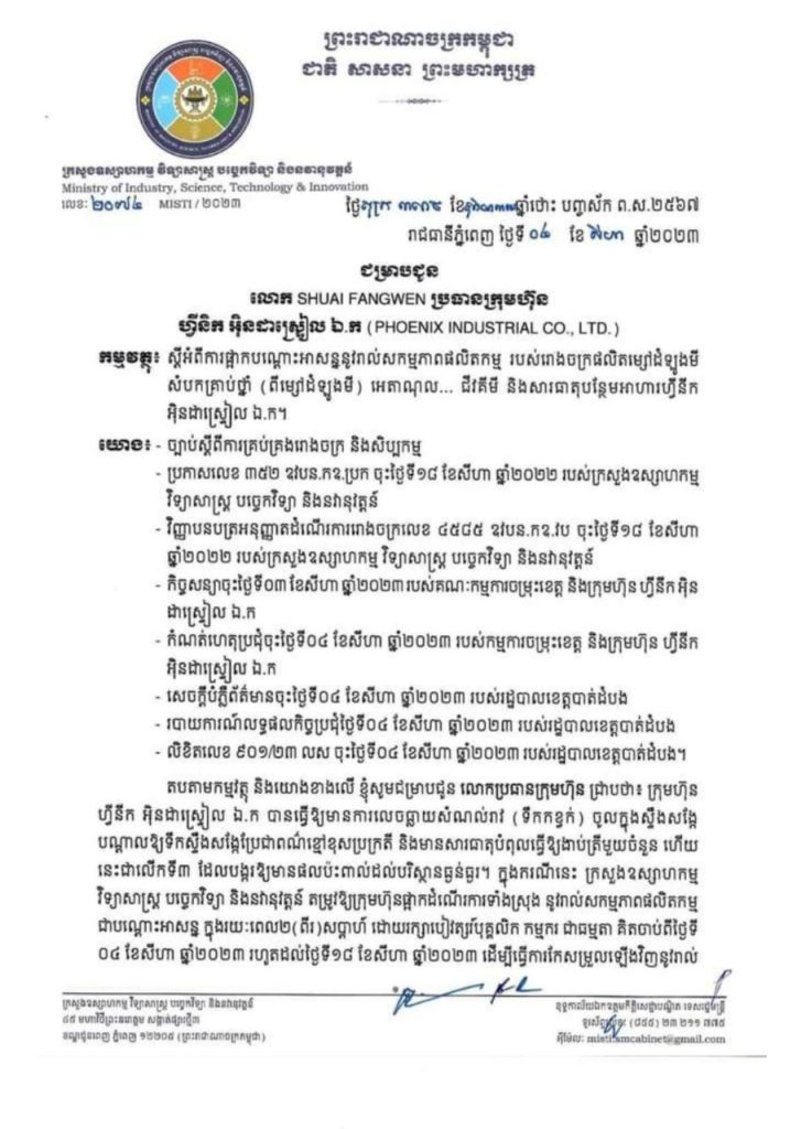 (ខេត្តបាត់ដំបង) ៖ ក្រសួងឧស្សាហកម្ម វិទ្យាសាស្ត្រ បច្ចេកវិទ្យា និងនវានុវត្តន៍ បានសម្រេចធ្វើការផ្អាកមិនឲ្យរោងចក្រចិនមួយកន្លែង ដែលមានឈ្មោះ Phoenix Industrial CO.,LTD.ស្ថិតក្នុងភូមិសាស្ត្រស្រុករតនមណ្ឌល ខេត្តបាត់ដំបង ដោយកំណត់ឲ្យផ្អាកដំណើរការជាបណ្តោះអាសន្ន នូវរាល់សកម្មភាពផលិតកម្ម របស់រោងចក្រ ក្រោយពីបានរកឃើញថា៖រោងចក្រនេះបានបង្កធ្វើឲ្យលេចធ្លាយនូវសំណល់រាវ (ទឹកកខ្វក់) បង្ហូរហូរចូលទៅក្នុងទឹកស្ទឹងសង្កែ កាលពីថ្ងៃទី០២ ខែសីហា ឆ្នាំ២០២៣ ។