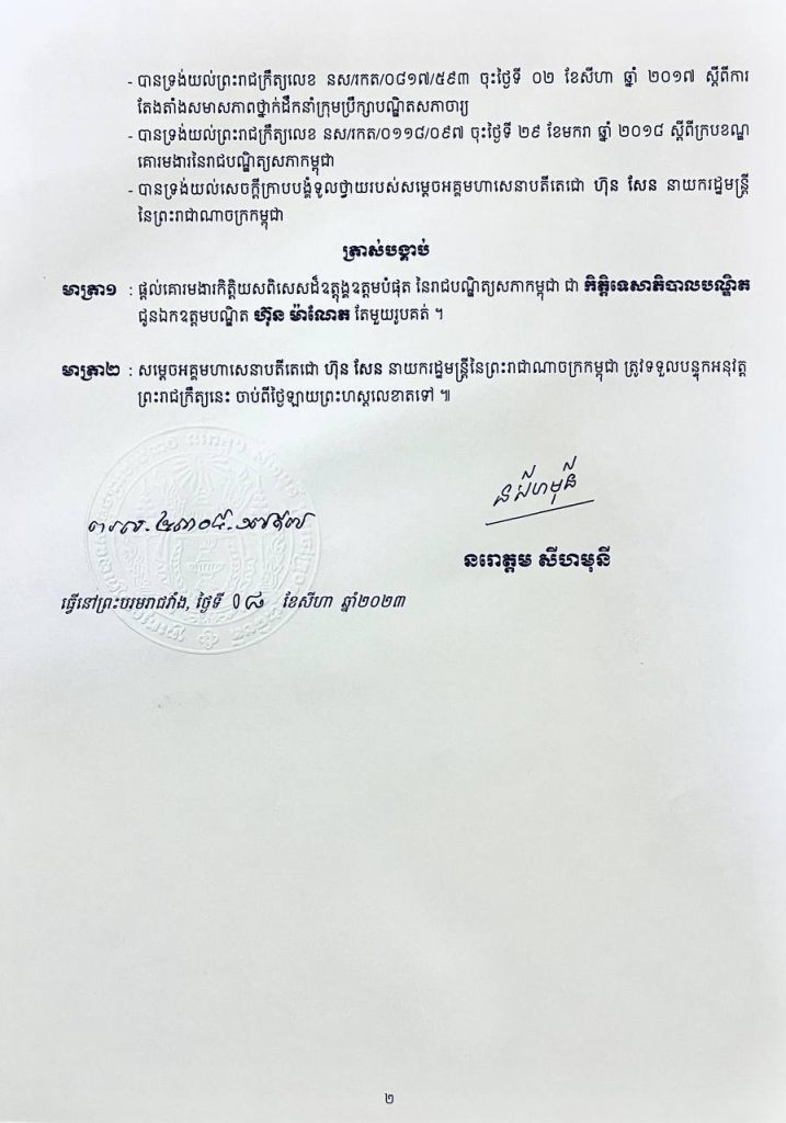 ព្រះមហាក្សត្រចេញព្រះរាជក្រឹត្យត្រាស់បង្គាប់ផ្តល់គោរមងារកិត្តិយសពិសេសដ៏ឧត្តុង្គឧត្តមបំផុតជូនឯកឧត្ដមបណ្ឌិត ហ៊ុន ម៉ាណែត តែមួយរូបគត់ ជាកិត្តិទេសាភិបាលបណ្ឌិត