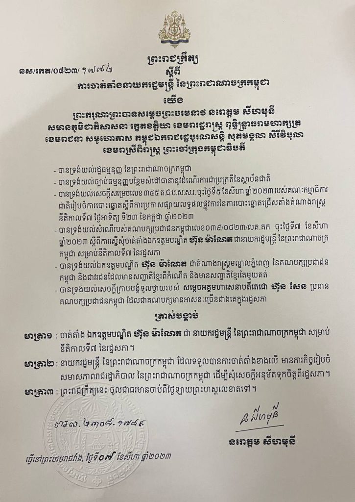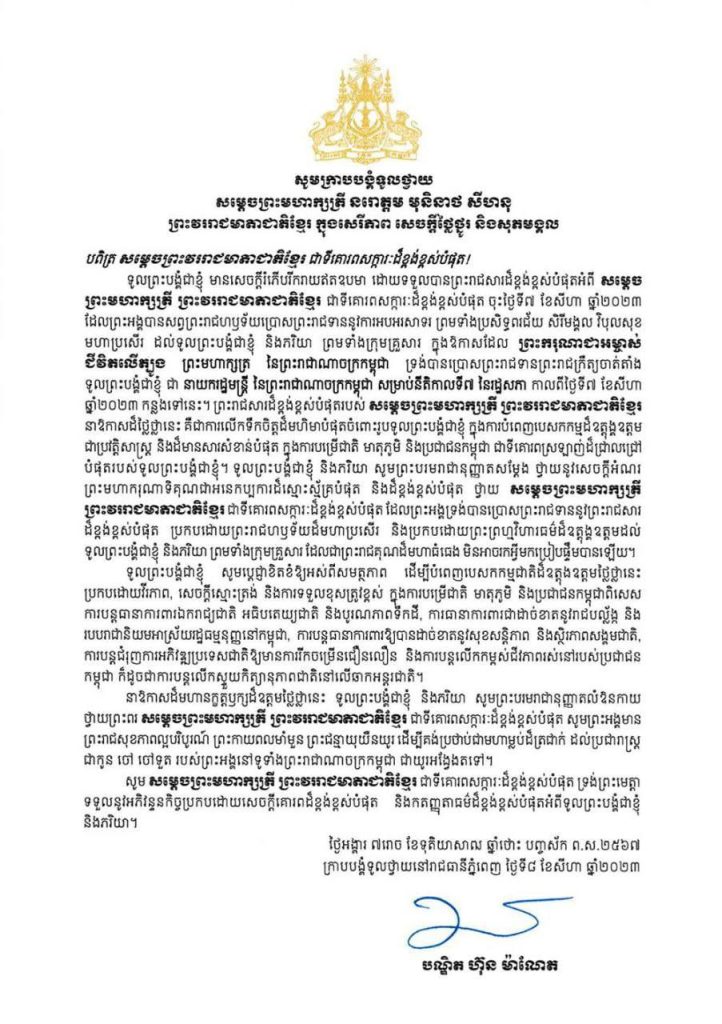 ទូលព្រះបង្គំជាខ្ញុំ មានសេចក្តីរំភើបរីករាយឥតឧបមា ដោយទទួលបានព្រះរាជសារដ៏ខ្ពង់ខ្ពស់បំផុតអំពី សម្ដេចព្រះមហាក្សត្រី ព្រះវររាជមាតាជាតិខ្មែរ ជាទីគោរពសក្ការៈដ៏ខ្ពង់ខ្ពស់បំផុត ចុះថ្ងៃទី៧ ខែសីហា ឆ្នាំ២០២៣ ដែលព្រះអង្គបានសព្វព្រះរាជហឫទ័យប្រោសព្រះរាជទាននូវការអបអរសាទរ ព្រមទាំងប្រសិទ្ធពរជ័យ សិរីមង្គល វិបុលសុខ មហាប្រសើរ ដល់ទូលព្រះបង្គំជាខ្ញុំ និងភរិយា ព្រមទាំងក្រុមគ្រួសារ ក្នុងឱកាសដែល ព្រះករុណាជាអម្ចាស់ ជីវិតលើត្បូង ព្រះមហាក្សត្រ នៃព្រះរាជាណាចក្រកម្ពុជា ទ្រង់បានប្រោសព្រះរាជទានព្រះរាជក្រឹត្យចាត់តាំង ទូលព្រះបង្គំជាំខ្ញុំ ជានាយករដ្ឋមន្ត្រី នៃព្រះរាជាណាចក្រកម្ពុជា សម្រាប់នីតិកាលទី៧ នៃរដ្ឋសភា កាលពីថ្ងៃទី៧ ខែសីហា ឆ្នាំ២០២៣កន្លងទៅនេះ។ ព្រះរាជសារដ៏ខ្ពង់ខ្ពស់បំផុតរបស់សម្តេចព្រះមហាក្សត្រី ព្រះវររាជមាតាជាតិខ្មែរ នាឱកាសដ៏ថ្លៃថ្លានេះ គឺជាការលើកទឹកចិត្តដ៏មហិមាបំផុតចំពោះរូបទូលព្រះបង្គំជាខ្ញុំ ក្នុងការបំពេញបេសកកម្មដ៏ឧត្តុង្គឧត្តម ជាប្រវត្តិសាស្ត្រ និងដ៏មានសារសំខាន់បំផុត ក្នុងការបម្រើជាតិ មាតុភូមិ និងប្រជាជនកម្ពុជា ជាទីគោរពស្រឡាញ់ដ៏ជ្រាលជ្រៅបំផុតរបស់ទូលព្រះបង្គំជាខ្ញុំ។ ទូលព្រះបង្គំជាខ្ញុំ និងភរិយា សូមព្រះបរមរាជានុញ្ញាតសម្តែង ថ្វាយនូវសេចក្ដីអំណរ ព្រះមហាករុណាទិគុណជាអនេកប្បការដ៏ស្មោះស្ម័គ្របំផុត និងដ៏ខ្ពង់ខ្ពស់បំផុត ថ្វាយសម្តេចព្រះមហាក្សត្រី ព្រះវររាជមាតាជាតិខ្មែរ ជាទីគោរពសក្ការៈដ៏ខ្ពង់ខ្ពស់បំផុត ដែលព្រះអង្គទ្រង់បានប្រោសព្រះរាជទាននូវព្រះរាជសារដ៏ខ្ពង់ខ្ពស់បំផុត ប្រកបដោយព្រះរាជហឫទ័យដ៏មហាប្រសើរ និងប្រកបដោយព្រះព្រហ្មវិហារធម៌ដ៏ឧត្ដុង្គឧត្តមដល់ទូលព្រះបង្គំជាខ្ញុំ និងភរិយា ព្រមទាំងក្រុមគ្រួសារ ដែលជាព្រះរាជគុណដ៏មហាធំធេង មិនអាចរកអ្វីមកប្រៀបផ្ទឹមបានឡើយ។