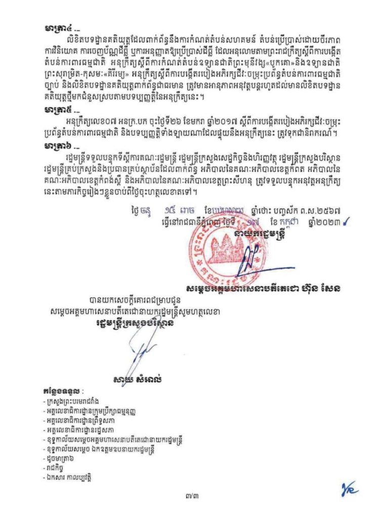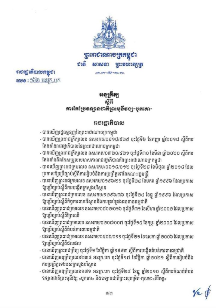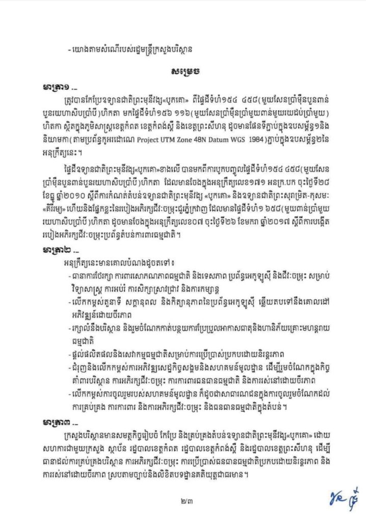 រាជរដ្ឋាភិបាលសម្រេចពង្រីកទំហំផ្ទៃដីឧទ្យានជាតិព្រះមុនីវង្ស “បូកគោ” ពីផ្ទៃដីទំហំ១៥៤ ៤៥៨ហិកតា មកផ្ទៃដីទំហំ១៥៦ ១១៦ហិកតា