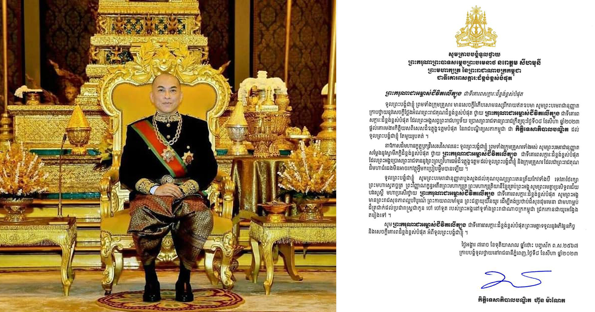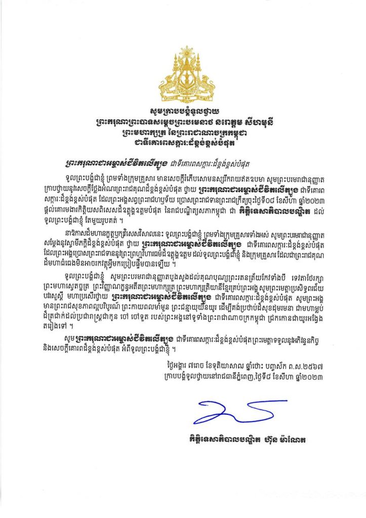 ឯកឧត្តមកិត្តិទេសាភិបាលបណ្ឌិត ហ៊ុន ម៉ាណែត ថ្វាយសារលិខិតថ្លែងអំណរព្រះរាជគុណព្រះមហាក្សត្រ