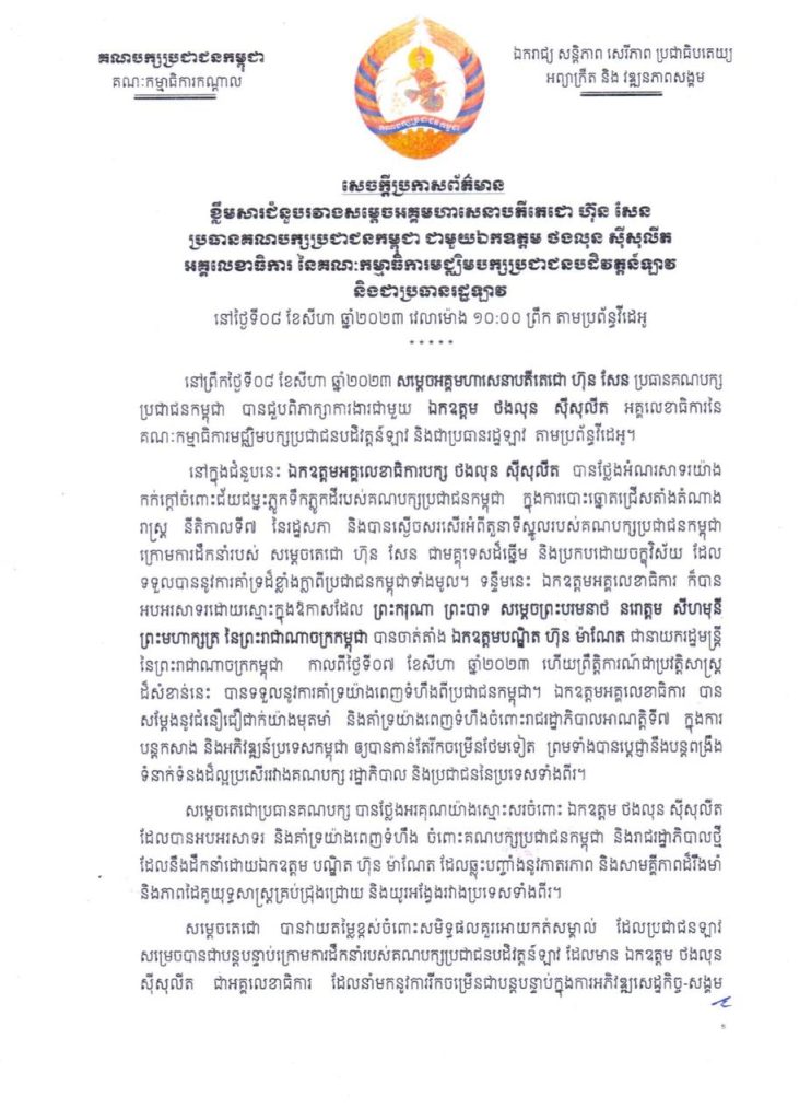 អបអរសាទរចំពោះជ័យជម្នះភ្លូកទឹកភ្លូកដីរបស់គណបក្សប្រជាជនកម្ពុជា និងបានអបអរសាទរ ដល់ លោក ហ៊ុន ម៉ាណែត ដែលត្រូវបានព្រះមហាក្សត្រ ទ្រង់ចាត់តាំង ជានាយករដ្ឋមន្ត្រី