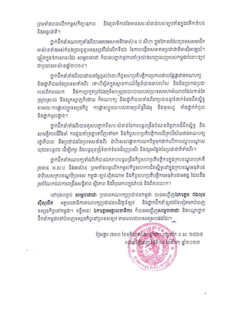 កម្ពុជា-ឡាវ ប្តេជ្ញាបន្តពង្រឹងទំនាក់ទំនងល្អប្រសើររវាងគណបក្ស រដ្ឋាភិបាល និងប្រជាជននៃប្រទេសទាំងពីរ 🇰🇭🇱🇦