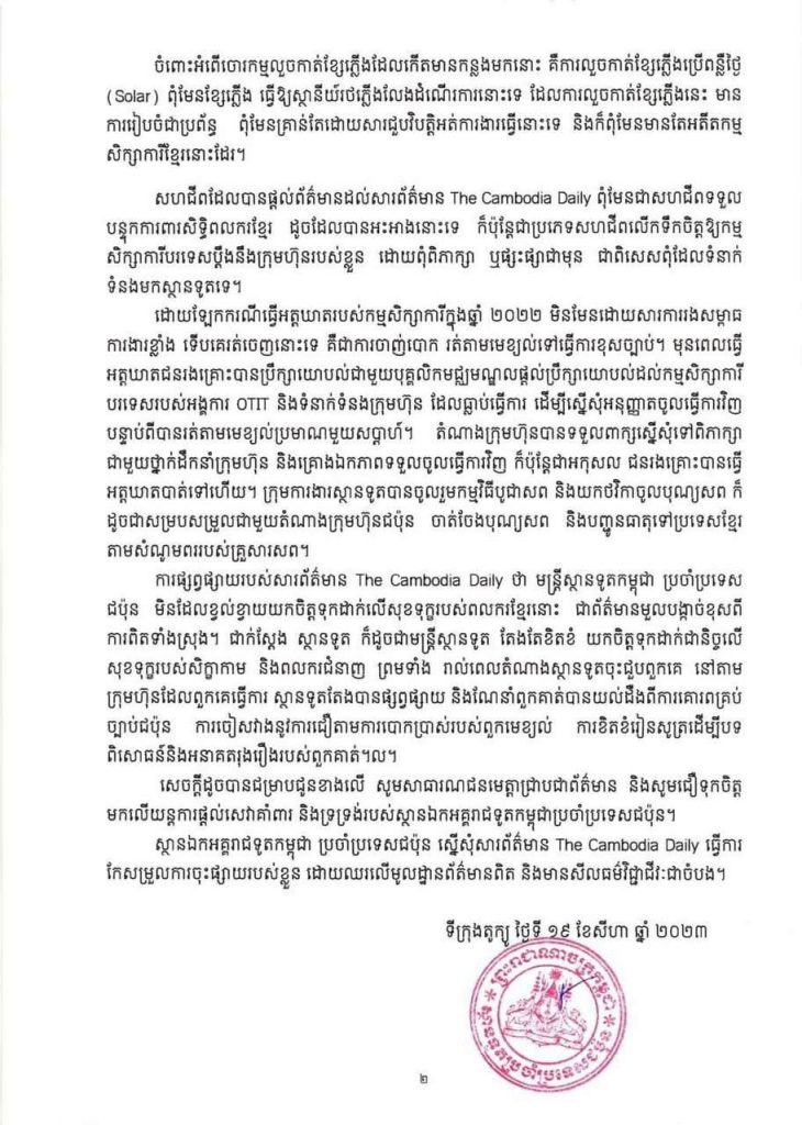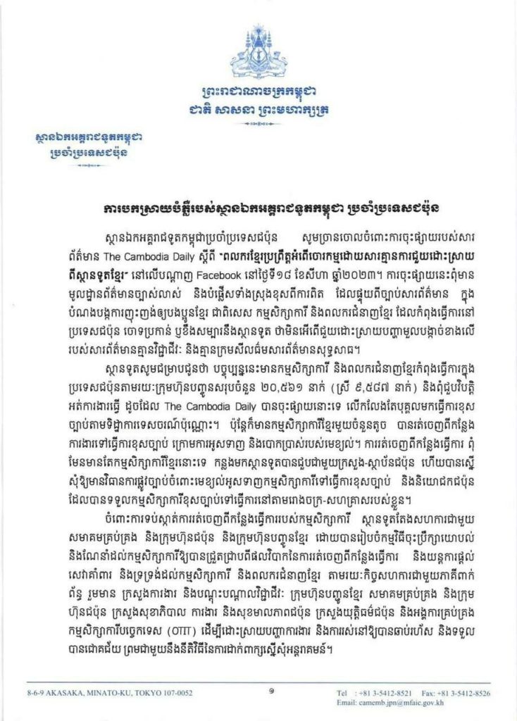 ភ្នំពេញ៖ ស្ថានឯកអគ្គរាជទូតកម្ពុជាប្រចាំប្រទេសជប៉ុន បានច្រានចោលចំពោះការចុះផ្សាយរបស់សារព័ត៌មាន The Cambodia Daily ស្ដីពី “ពលករខ្មែរប្រព្រឹត្តអំពើចោរកម្មដោយសារគ្មានការជួយដោះស្រាយពីស្ថានទូតខ្មែរ” នៅលើបណ្ដាញ Facebook កាលពីថ្ងៃទី១៨ ខែសីហា ឆ្នាំ២០២៣។ ដោយការចុះផ្សាយនេះ ពុំមានមូលដ្ឋានច្បាស់លាស់ និងបំផ្លើសទាំងស្រុងខុសពីការពិតដែលផ្ទុយពីច្បាប់សារព័ត៌មាន ក្នុងបំណងបង្កការញុះញង់ឱ្យបងប្អូនខ្មែរ ជាពិសេស កម្មសិក្សាការី និងពលករជំនាញខ្មែរ ដែលកំពុងធ្វើការនៅប្រទេសជប៉ុន ចោទប្រកាន់ ឬខឹងសម្បារនឹងស្ថានទូតថា មិនអើពើជួយដោះស្រាយបញ្ហាមួលបង្កាច់ខាងលើ របស់សារព័ត៌មានគ្មានវិជ្ជាជីវៈ និងគ្មានក្រមសីលធ៌មសារព័ត៌មានសុទ្ធសាធ។ នេះបើយោងតាមលិខិតបកស្រាយបំភ្លឺរបស់ស្ថានឯកអគ្គរាជទូតកម្ពុជាប្រចាំប្រទេសជប៉ុន នៅថ្ងៃទី១៩ ខែសីហា ឆ្នាំ២០២៣។