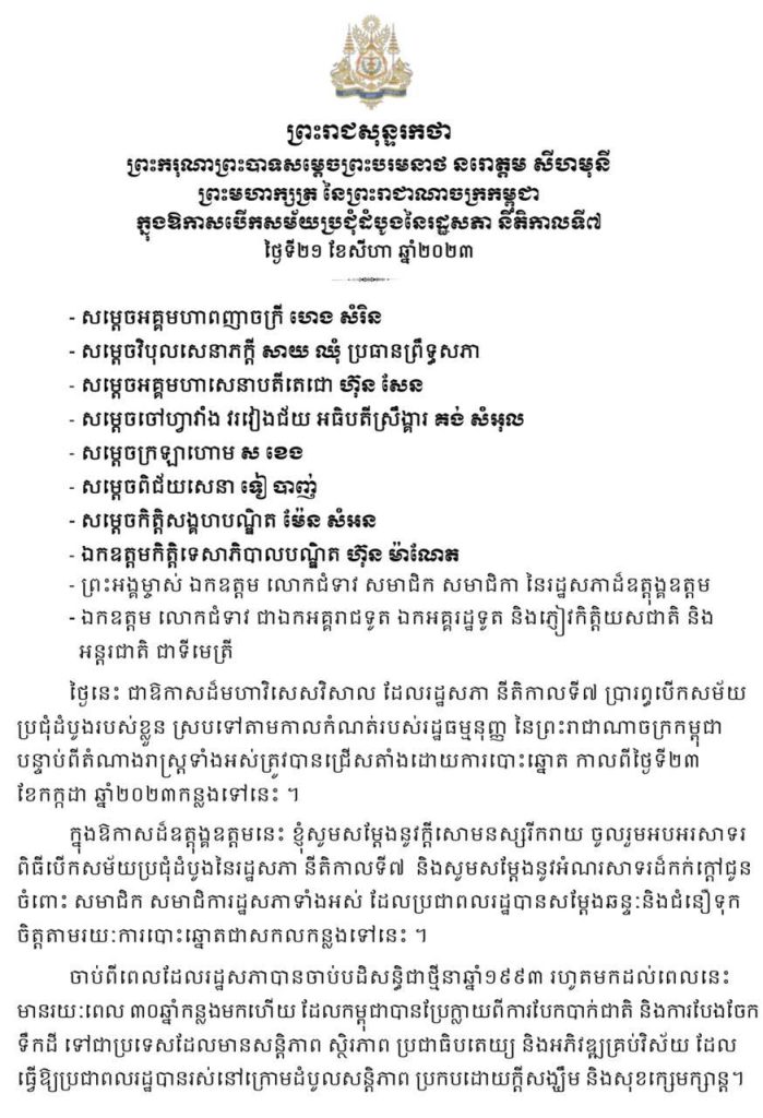 ព្រះករុណាព្រះបាទសម្តេចព្រះបរមនាថ នរោត្តម សីហមុនី ព្រះមហាក្សត្រ នៃព្រះរាជាណាចក្រកម្ពុជា ក្នុងឱកាសបើកសម័យប្រជុំដំបូងនៃរដ្ឋសភា នីតិកាលទី៧ ថ្ងៃទី២១ខែសីហា ឆ្នាំ២០២៣។