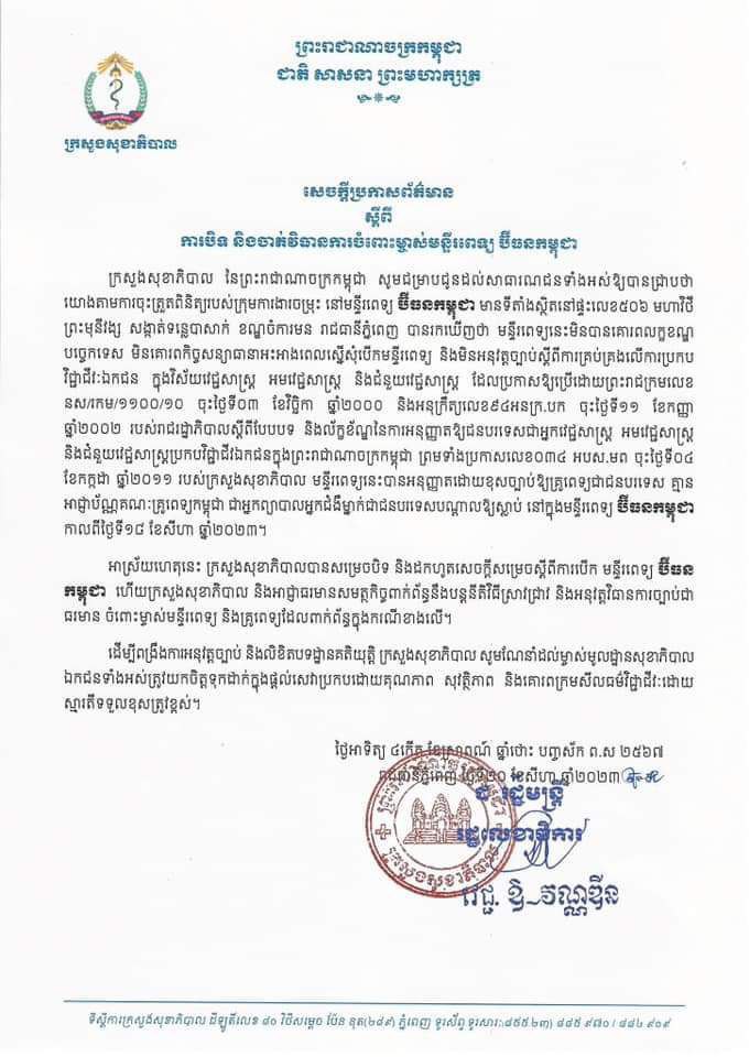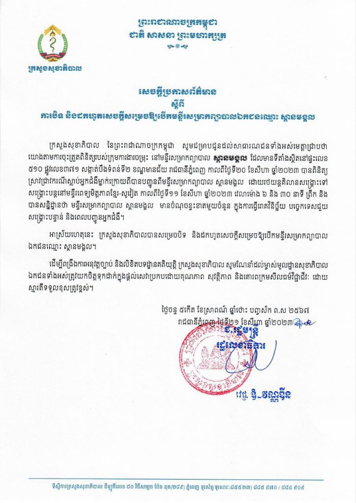 នេះបើយោងតាមសេចក្តីសម្រេចពីរផ្សេងគ្នា ដែលចុះហត្ថលេខា ដោយ លោកជំទាវ ឱ វណ្ឌឌីន រដ្ឋលេខាធិការក្រសួងសុខាភិបាលនៅថ្ងៃទី២០ និងទី២១ ខែសីហា ឆ្នាំ២០២៣។