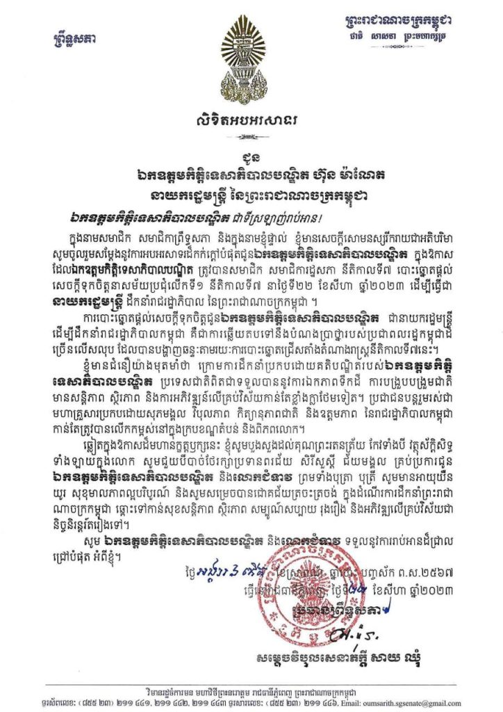 សម្តេចវិបុលសេនាភក្តី សាយ ឈុំ ប្រធានព្រឹទ្ធសភា ក្នុងនាមសមាជិក សមាជិកាព្រឹទ្ធសភា និងក្នុងនាមផ្ទាល់ សម្តេចមានសេចក្តីសោមនស្សរីករាយជាអតិបរិមា សូមចូលរួមសម្ដែងនូវការអបអរសាទរដ៏កក់ក្តៅបំផុតជូនឯកឧត្តមកិត្តិទេសាភិបាលបណ្ឌិត ក្នុងឱកាសដែលឯកឧត្តមកិត្តិទេសាភិបាលបណ្ឌិត ត្រូវបានសមាជិក សមាជិការដ្ឋសភា នីតិកាលទី៧ បោះឆ្នោតផ្តល់សេចក្តីទុកចិត្តនាសម័យប្រជុំលើកទី១ នីតិកាលទី៧ នាថ្ងៃទី២២ ខែសីហា ឆ្នាំ២០២៣ ដើម្បីធ្វើជានាយករដ្ឋមន្ត្រី ដឹកនាំរាជរដ្ឋាភិបាល នៃព្រះរាជាណាចក្រកម្ពុជា។
