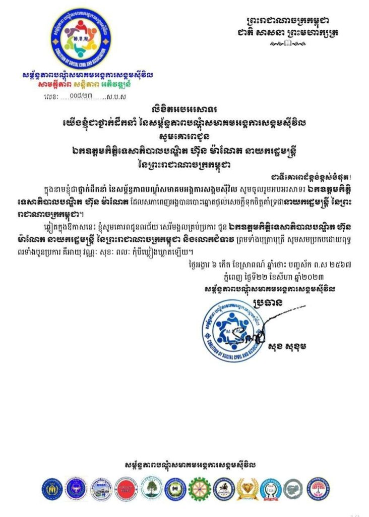ឆ្លៀតក្នុងឱកាសនេះ សម្ព័ន្ធភាពបណ្ដុំសមាគមអង្គការសង្គមស៊ីវិល សូមជូនពរជ័យ សេរីមង្គលគ្រប់ប្រការ ជូនឯកឧត្តមកិត្តិទេសាភិបាលបណ្ឌិត ហ៊ុន ម៉ាណែត នាយករដ្ឋមន្ត្រី នៃព្រះរាជាណាចក្រកម្ពុជា និងលោកជំទាវ ព្រមទាំងបុត្រាបុត្រី សូមសមប្រកបដោយពុទ្ធពរទាំងបួនប្រការ គឺអាយុ វណ្ណៈ សុខៈ ពលៈ កុំបីឃ្លៀងឃ្លាតឡើយ៕