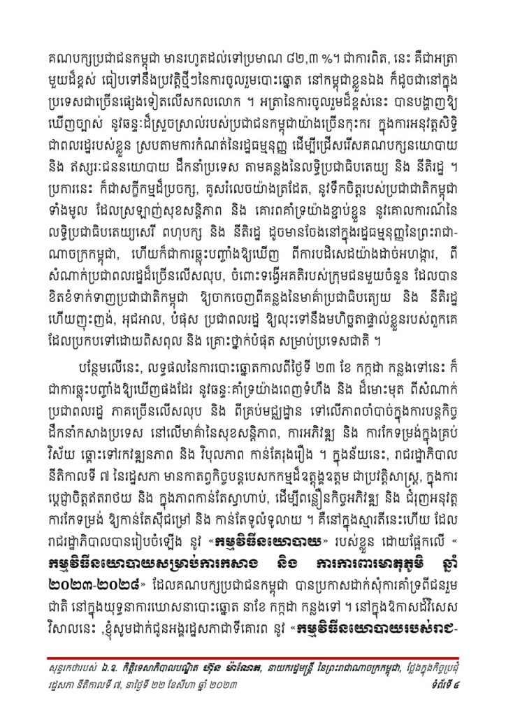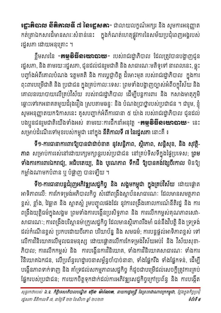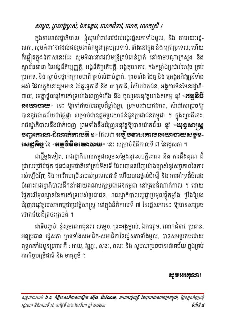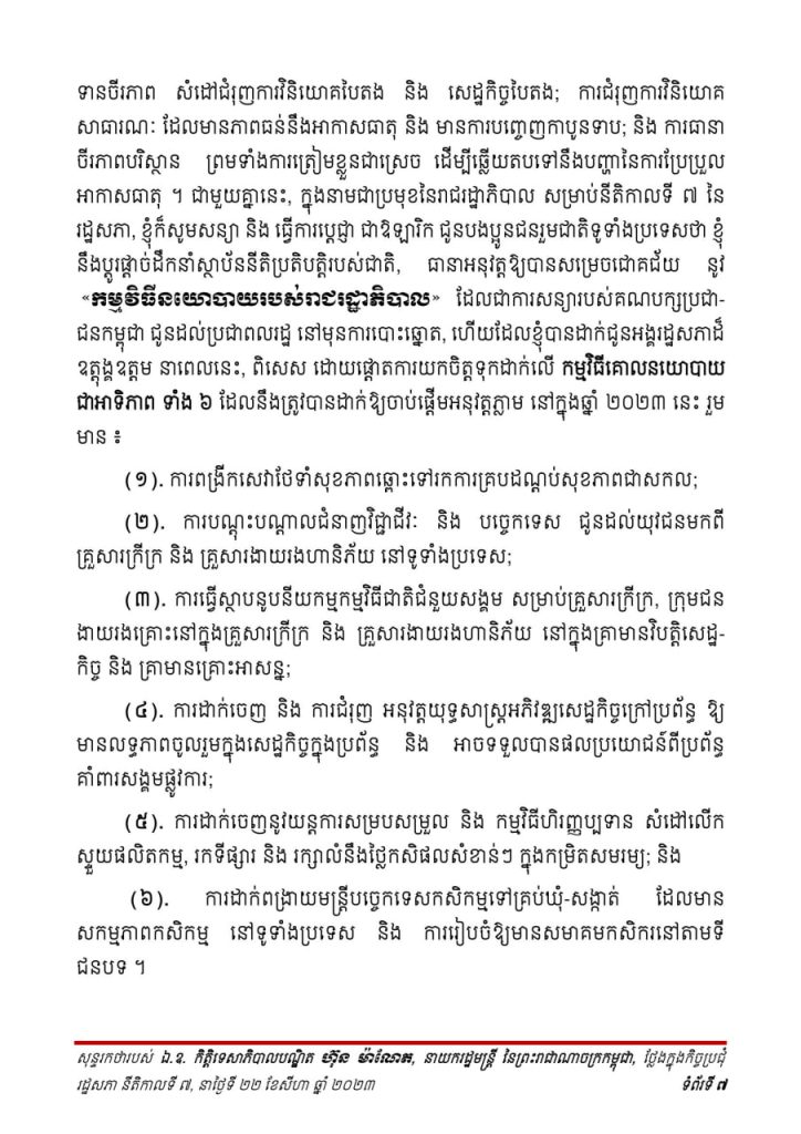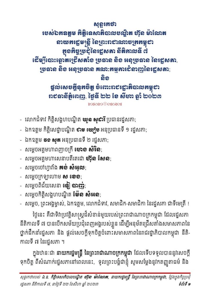 សុន្ទរកថាទាំងស្រុងរបស់ឯកឧត្តមកិត្តិទេសាភិបាលបណ្ឌិត ហ៊ុន ម៉ាណែត នាយករដ្ឋមន្ត្រីនៃព្រះរាជាណាចក្រកម្ពុជា ក្នុងកិច្ចប្រជុំរដ្ឋសភា នីតិកាលទី៧ នៃថ្ងៃទី២២ ខែសីហា ឆ្នាំ២០២៣