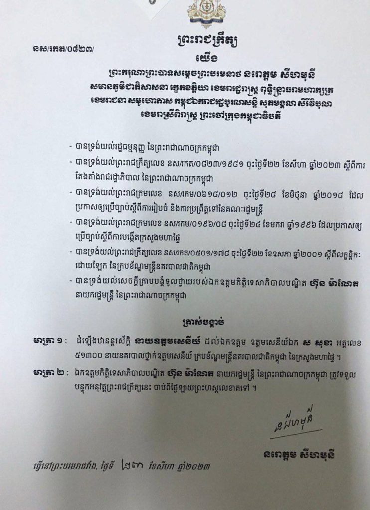 ភ្នំពេញ៖ ព្រះករុណា ព្រះបាទសម្តេចព្រះបរមនាថ នរោត្តម សីហមុនី ព្រះមហាក្សត្រ នៃព្រះរាជាណាចក្រកម្ពុជា បានចេញព្រះរាជក្រឹត្យត្រាស់បង្គាប់ដំឡើងឋានន្តរស័ក្តិ នាយឧត្តមសេនីយ៍ ដល់ឯកឧត្តម ឧត្តមសេនីយ៍ឯក ស សុខា នាយនគរបាលថ្នាក់ឧត្តមសេនីយ៍ ក្របខណ្ឌនគរបាលជាតិ នៃក្រសួងមហាផ្ទៃ។ នេះបើយោងតាមព្រះរាជក្រឹត្យចុះថ្ងៃទី២៣ ខែសីហា ឆ្នាំ២០២៣។