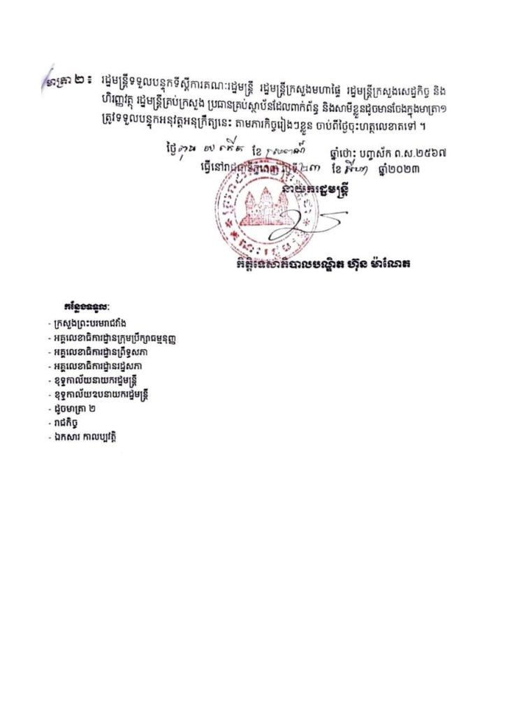 ភ្នំពេញ៖ ឯកឧត្តមកិត្តិទេសាភិបាលបណ្ឌិត ហ៊ុន ម៉ាណែត នាយករដ្ឋមន្ត្រី នៃព្រះរាជាណាចក្រកម្ពុជា បានចេញអនុក្រឹត្យសម្រេចផ្ទេរសម្រួលភារកិច្ច និងតែងតាំងនាយនគរបាលថ្នាក់ឧត្តមសេនីយ៍ចំនួន២រូប នៃក្រសួងមហាផ្ទៃ មានដូចជា៖ ១.ឧត្តមសេនីយ៍ឯក ស រដ្ឋា ពីអគ្គនាយករង នៃអគ្គនាយកដ្ឋានអន្តោប្រវេសន៍ ទៅជាអគ្គស្នងការរង នៃអគ្គស្នងការដ្ឋាននគរបាលជាតិ។ ២.ឧត្តមសេនីយ៍ទោ ជួន ណារិន ពីស្នងការ នៃស្នងការដ្ឋាននគរបាលខេត្តព្រះសីហនុ ទៅជាអគ្គស្នងការរង នៃអគ្គស្នងការដ្ឋាននគរបាលជាតិ។ នេះបើយោងតាមអនុក្រឹត្យចុះថ្ងៃទី២៣ ខែសីហា ឆ្នាំ២០២៣៕