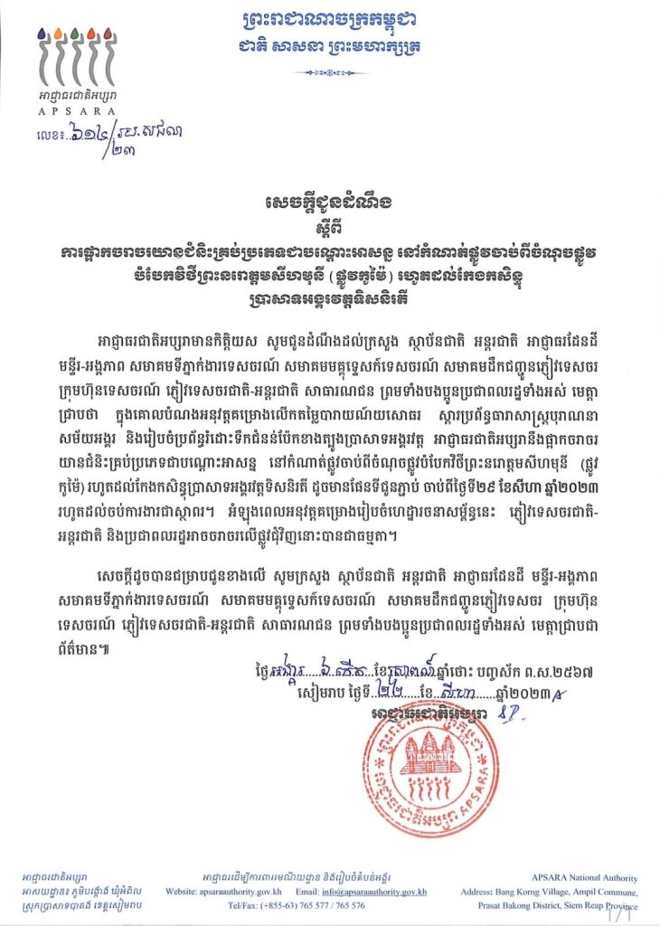 សៀមរាប៖ អាជ្ញាធរជាតិអប្សរាបានប្រកាសផ្អាកចរាចរចំពោះយានជំនិះគ្រប់ប្រភេទជាបណ្តោះអាសន្ននៅកំណាត់ផ្លូវចាប់ពីចំណុចផ្លូវបំបែកវិថីព្រះនរោត្ដមសីហមុនី (ផ្លូវកូម៉ៃ) រហូតដល់កងកសិន្ទុ ប្រាសាទអង្គរវត្តទិសនិរតី ចាប់ពីថ្ងៃទី២៩ ខែសីហា ឆ្នាំ២០២៣ រហូតដល់ចប់ការងារជាស្ថាពរ ។ នេះបើតាមសេចក្តីជូនដំណឹងរបស់អាជ្ញាធរជាតិអប្សរា កាលពីថ្ងៃទី២២ ខែសីហា ឆ្នាំ២០២៣ ជម្រាបដល់ក្រសួង ស្ថាប័នជាតិ អន្តរជាតិ អាជ្ញាធរដែនដី មន្ទីរ-អង្គភាព សមាគមទីភ្នាក់ងារទេសចរណ៍ សមាគមមគ្គុទ្ទេសក៍ទេសចរណ៍ ភ្ញៀវទេសចរជាតិ-អន្តរជាតិ និងសាធារណជន។