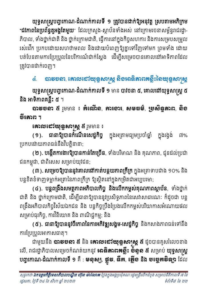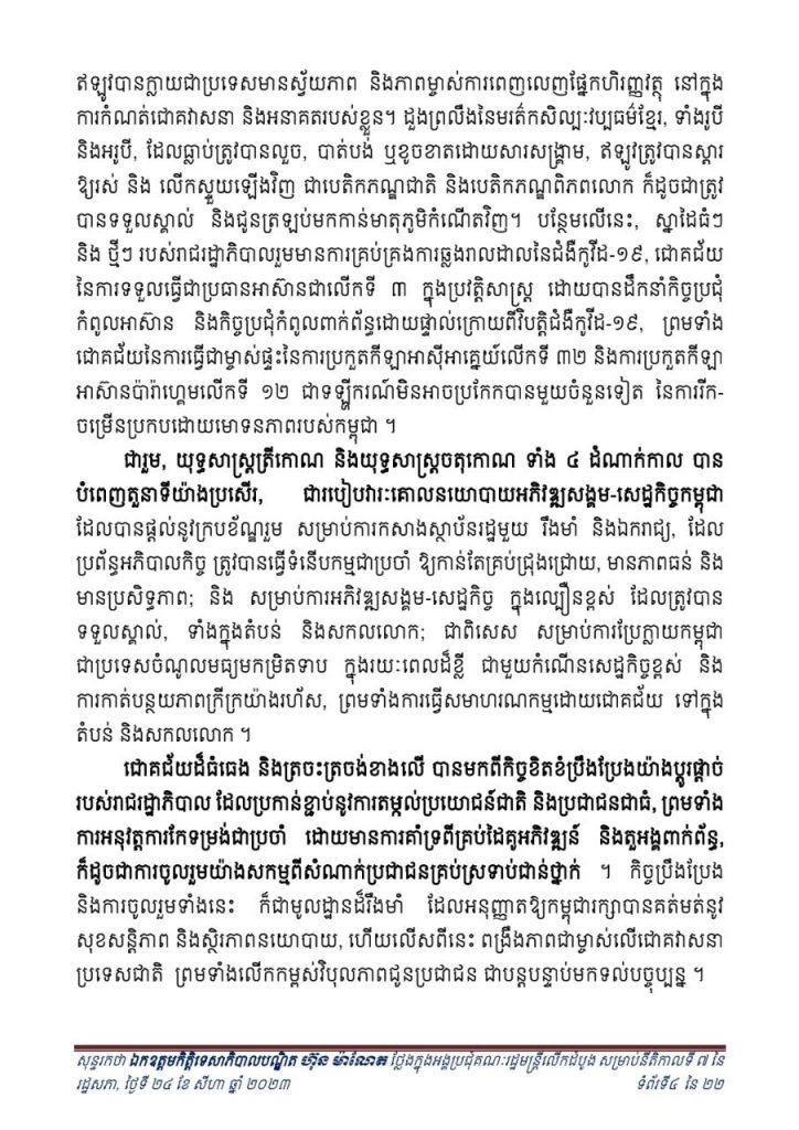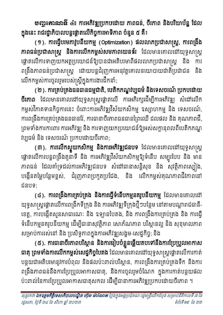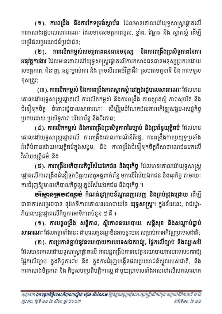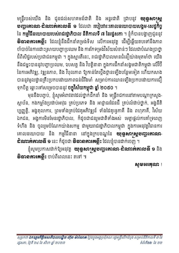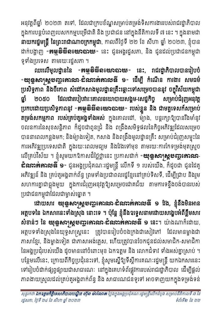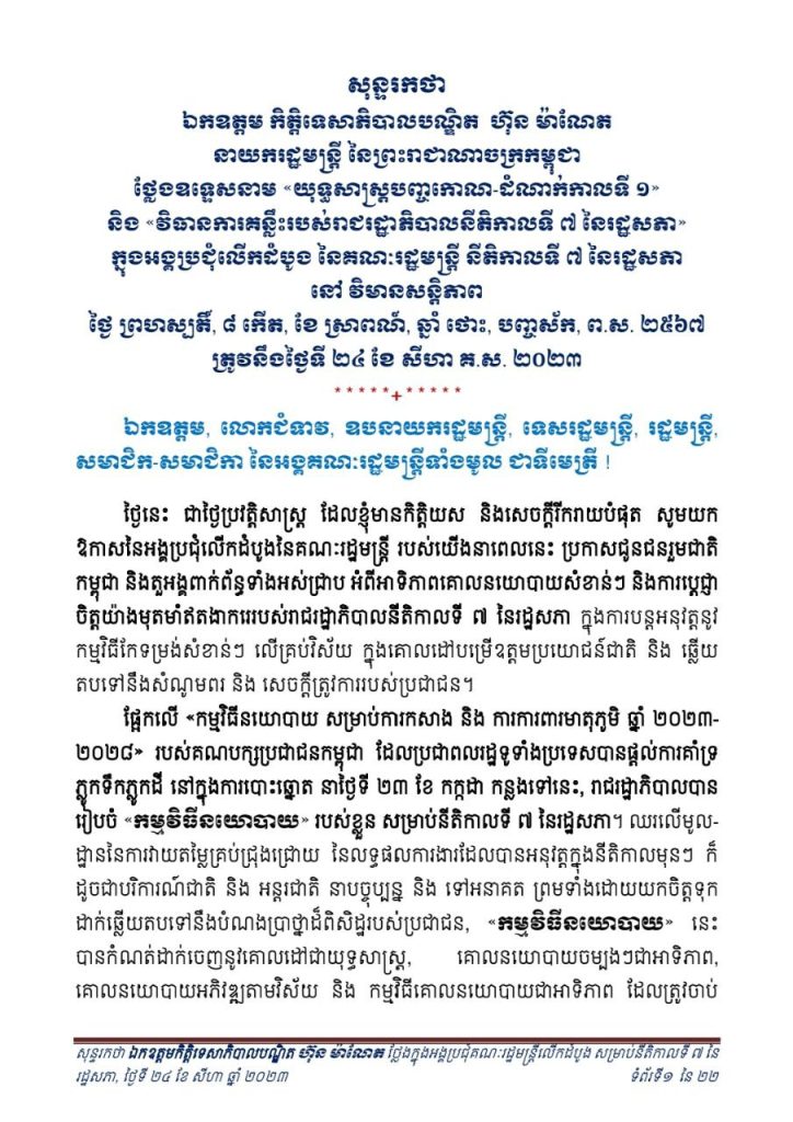 សុន្ទរកថា ឯកឧត្តម កិតិ្តទេសាភិបាលបណ្ឌិត ហ៊ុន ម៉ាណែត នាយករដ្ឋមន្ត្រី នៃព្រះរាជាណាចក្រកម្ពុជា ថ្លែងឧទ្ទេសនាម «យុទ្ធសាស្ត្របញ្ចកោណ-ដំណាក់កាលទី១» និង «វិធានការគន្លឹះរបស់រាជរដ្ឋាភិបាលនីតិកាលទី៧ នៃរដ្ឋសភា» ក្នុងអង្គប្រជុំលើកដំបូង នៃគណៈរដ្ឋមន្ត្រី នីតិកាលទី ៧ នៃរដ្ឋសភា នៅ វិមានសន្តិភាព ព្រឹកថ្ងៃព្រហស្បតិ៍ ទី២៤ សីហា ២០២៣ ៕