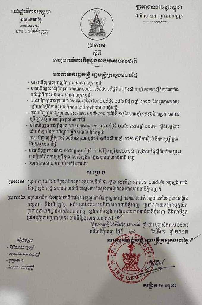 (ភ្នំពេញ) ៖ នៅព្រឹក ថ្ងៃ ទី ២៤ ខែសីហា ឆ្នាំ២០២៣នេះ រាជរដ្ឋាភិបាល កម្ពុជា បានសម្រេច តែងតាំងប្រគល់ភារកិច្ចជូនលោកឧត្តមសេនីយ៍ទោ ជួន ណារិន្ទ អត្តលេខ ០៣៥០២ អគ្គស្នងការរង នៃអគ្គស្នងការដ្ឋាននគរបាលជាតិ ជាស្នងការ នៃស្នងការដ្ឋាននគរបាលរាជធានីភ្នំពេញ ។