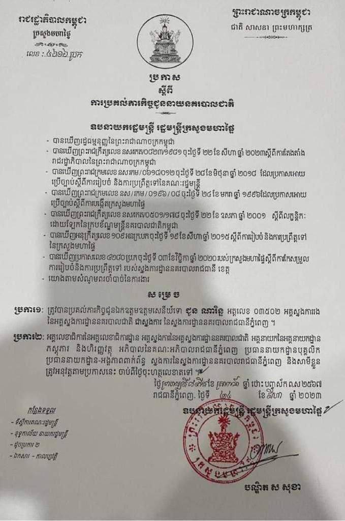 សេចក្ដីសម្រេចប្រគល់ភារកិច្ចជូន លោកឧត្តមសេនីយ៍ទោ ជួន ណារិន្ទ អគ្គស្នងការរងនគរបាលជាតិ ជាស្នងការនគរបាលរាជធានីភ្នំពេញOne-Minuteអត្ថបទដោយ៖AMS OneMinute #ams1minute AMS OneMinuteអត្ថបទមុនអត្ថបទបន្ទាប់