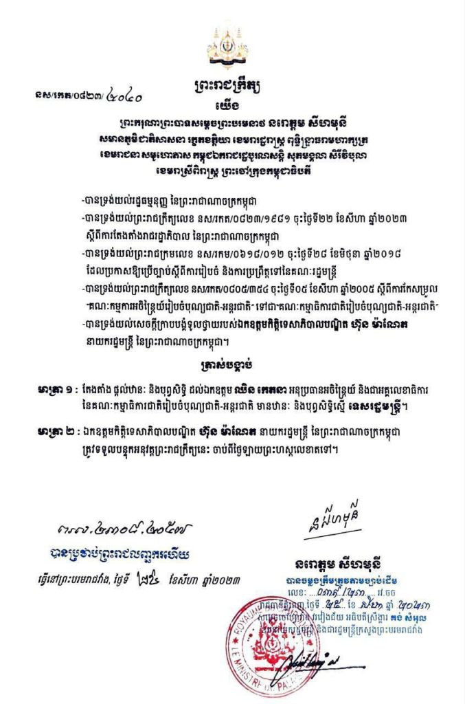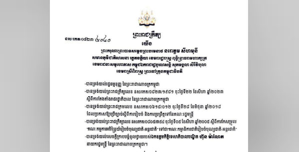 ព្រះមហាក្សត្រ ចេញព្រះរាជក្រឹត្យត្រាស់បង្គាប់តែងតាំងផ្តល់ឋានៈ និងបុព្វសិទ្ធិដល់លោក ឈិន កេតនា អនុប្រធានអចិន្រ្តៃយ៍ និងជាអគ្គលេខាធិការ នៃគណៈកម្មាធិការជាតិរៀបចំបុណ្យជាតិ-អន្តរជាតិOne-Minuteអត្ថបទដោយ៖AMS OneMinute #ams1minute AMS OneMinuteអត្ថបទមុនអត្ថបទបន្ទាប់