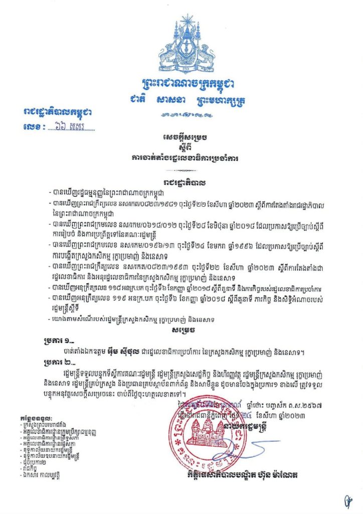 រាជរដ្ឋាភិបាល ចេញសេចក្តីសម្រេច ចាត់តាំងឯកឧត្តម អ៉ឹម ស៊ីថុល ជារដ្ឋលេខាធិការប្រចាំការ នៃក្រសួងកសិកម្ម រុក្ខាប្រមាញ់ និងនេសាទOne-Minuteអត្ថបទដោយ៖AMS OneMinute #ams1minute AMS OneMinuteអត្ថបទមុនអត្ថបទបន្ទាប់