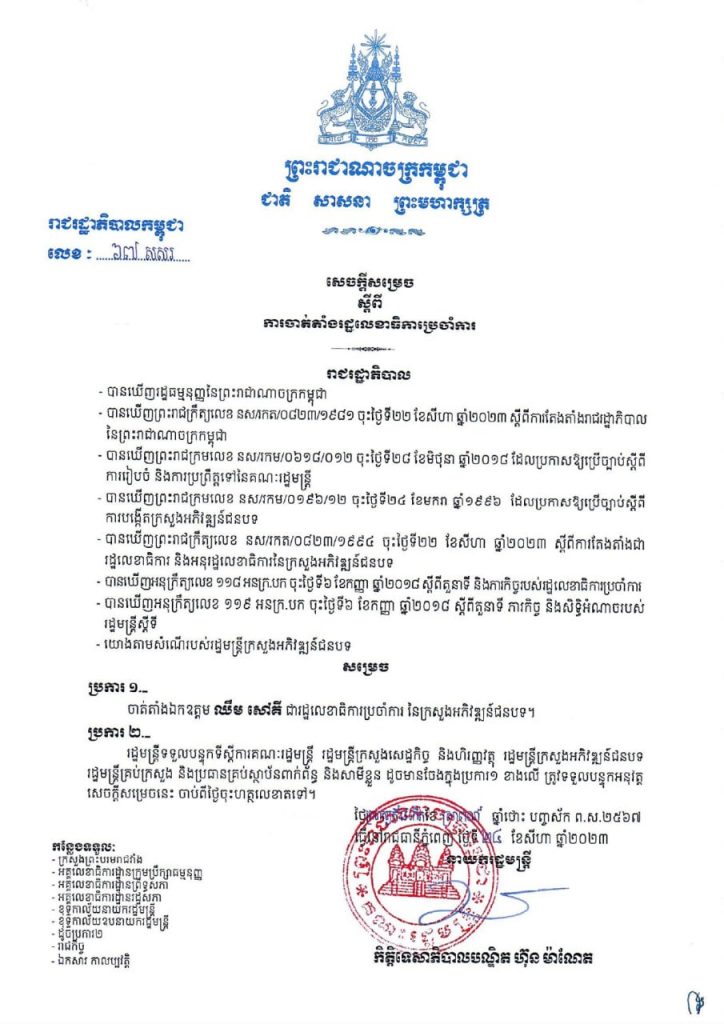 រាជរដ្ឋាភិបាល ចេញសេចក្តីសម្រេច ចាត់តាំងឯកឧត្តម ឈឹម សៅគី ជារដ្ឋលេខាធិការប្រចាំការ នៃក្រសួងអភិវឌ្ឍន៍ជនបទOne-Minuteអត្ថបទដោយ៖AMS OneMinute #ams1minute AMS OneMinuteអត្ថបទមុនអត្ថបទបន្ទាប់