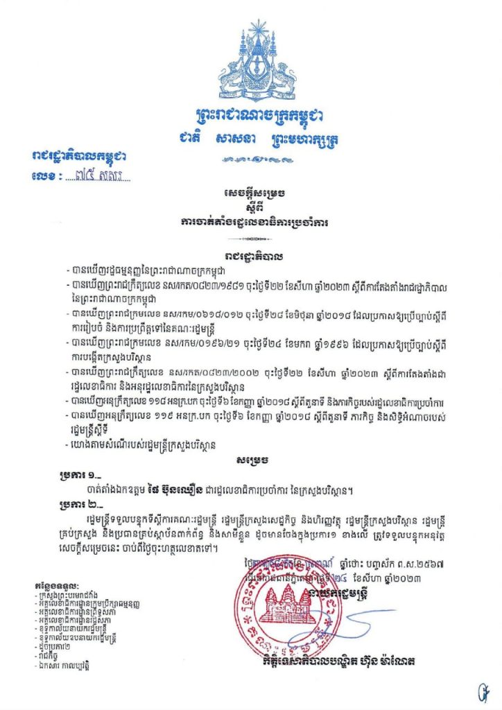 រាជរដ្ឋាភិបាល ចេញសេចក្តីសម្រេច ចាត់តាំងឯកឧត្តម ផៃ ប៊ុនឈឿន ជារដ្ឋលេខាធិការប្រចាំការ នៃក្រសួងបរិស្ថានOne-Minuteអត្ថបទដោយ៖AMS OneMinute #ams1minute AMS OneMinuteអត្ថបទមុនអត្ថបទបន្ទាប់