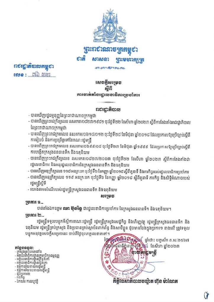 រាជរដ្ឋាភិបាល ចេញសេចក្តីសម្រេច ចាត់តាំងឯកឧត្តម ឈា ប៊ុនរិទ្ធ ជារដ្ឋលេខាធិការប្រចាំការ នៃក្រសួងធនធានទឹក និងឧតុនិយមOne-Minuteអត្ថបទដោយ៖AMS OneMinute #ams1minute AMS OneMinuteអត្ថបទមុនអត្ថបទបន្ទាប់