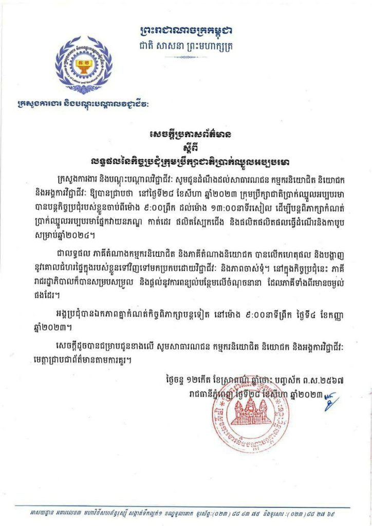 គួររំឭកថា ក្រុមប្រឹក្សាជាតិប្រាក់ឈ្នួលអប្បបរមា អាណត្តិទី៣ ដែលមានសមាសភាពស្មើៗគ្នាពីតំណាងភាគីរាជរដ្ឋាភិបាល ភាគីសហជីព និងភាគីនិយោជក បានបើកកិច្ចពិភាក្សាគ្នា១លើករួចមកហើយ កាលពីថ្ងៃទី១៦ ខែសីហា ឆ្នាំ២០២៣ ហើយនៅថ្ងៃទី២៨ ខែសីហាឆ្នាំ ២០២៣នេះ ក្រុមប្រឹក្សាជាតិប្រាក់ឈ្នួលអប្បបរមា បានបើកកិច្ចពិភាក្សារបស់ខ្លួនជាលើកទី២ ដោយកិច្ចប្រជុំនេះបានប្រព្រឹត្តទៅអស់រយៈពេល ៤ម៉ោង គឺចាប់ពីម៉ោង ៩:០០ព្រឹក ដល់ម៉ោង ១៣:០០នាទីរសៀល ដើម្បីបន្តពិភាក្សាកំណត់ប្រាក់ឈ្នួលអប្បបរមាផ្នែកវាយនភណ្ឌ កាត់ដេរ ផលិតស្បែកជើង និងផលិតផលិតផលធ្វើដំណើរ និង កាបូប សម្រាប់ឆ្នាំ២០២៤។