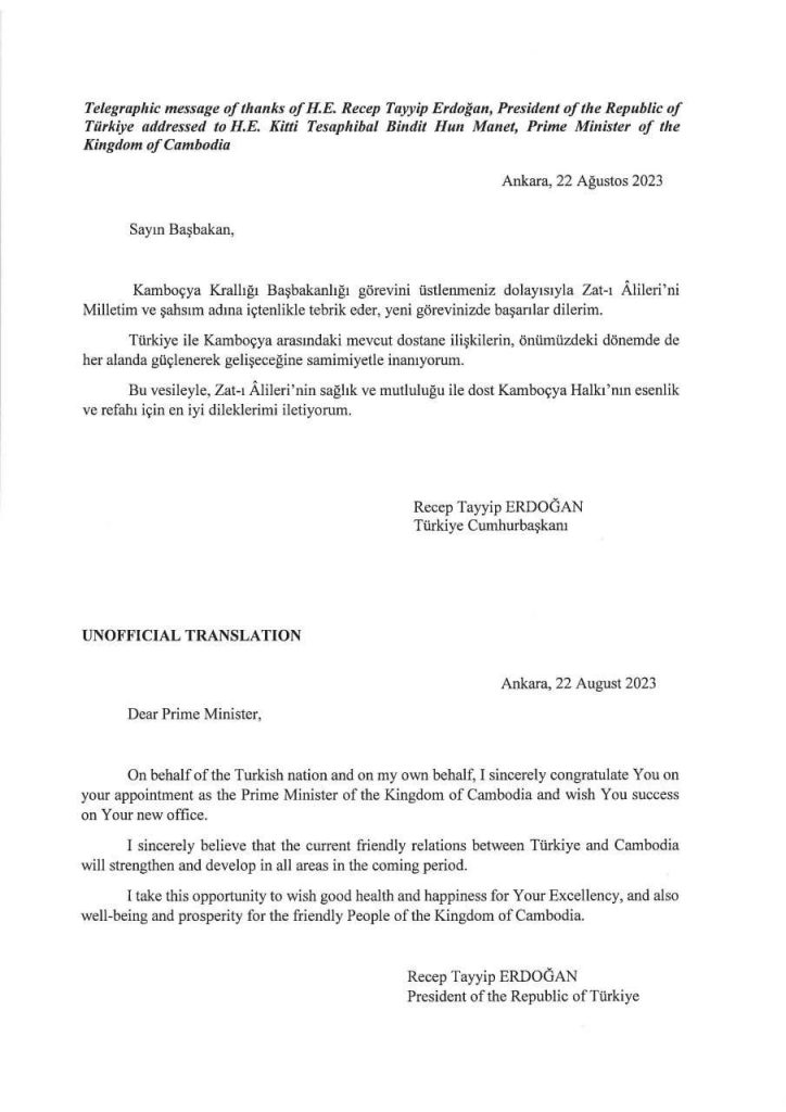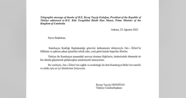 លោក Recep Tayyip ERDOGAN ប្រធានាធិបតីតួកគី បានផ្ញើសារលិខិតអបអរសាទរជូន ឯកឧត្តមកិត្តិទេសាភិបាលបណ្ឌិត ហ៊ុន ម៉ាណែត សម្រាប់ការចូលកាន់តំណែងជា នាយករដ្ឋមន្ត្រីថ្មីរបស់កម្ពុជា 🇰🇭🇹🇷One-Minuteអត្ថបទដោយ៖AMS OneMinute #ams1minute AMS OneMinuteអត្ថបទមុនអត្ថបទបន្ទាប់