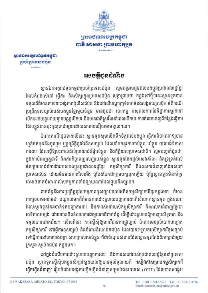 ស្ថានទូតកម្ពុជាប្រចាំជប៉ុនអំពាវនាវដល់ពលរដ្ឋខ្មែរដែលកំពុងរស់នៅ និងធ្វើការនៅជប៉ុនត្រូវគោរពច្បាប់ចៀសវាងប្រព្រឹត្តអំពើខុសច្បាប់នានា