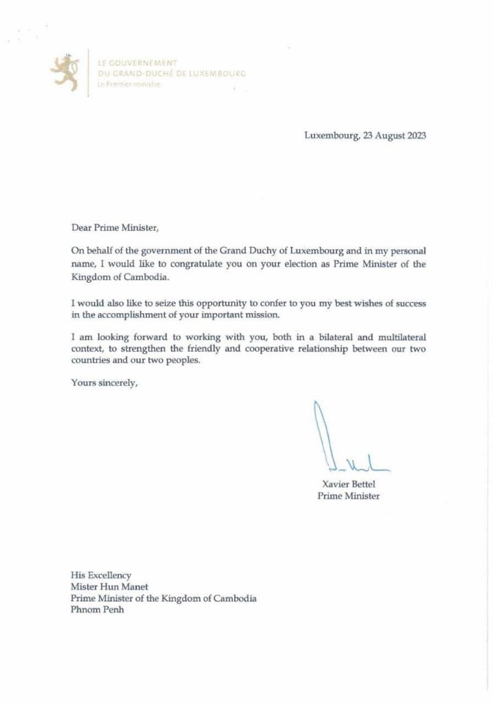 លោក Xavier Bettel នាយករដ្ឋមន្រ្តីប្រទេសលុចសំបួ បានផ្ញើសារលិខិតអបអរសាទរជូន ឯកឧត្តមកិត្តិទេសាភិបាលបណ្ឌិត ហ៊ុន ម៉ាណែត