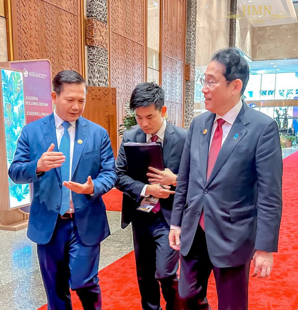 (ភ្នំពេញ)៖ ក្នុងឱកាសនៃកិច្ចប្រជុំកំពូលអាស៊ាន លើកទី៤៣ និងកិច្ចប្រជុំកំពូលពាក់ព័ន្ធ នៅទីក្រុងហ្សាការតា ប្រទេសឥណ្ឌូនេស៊ី នាព្រឹកថ្ងៃព្រហស្បតិ៍ទី៧ កញ្ញា ២០២៣ សម្តេចមហាបវរធិបតី ហ៊ុន ម៉ាណែត នាយករដ្ឋមន្ត្រី នៃព្រះរាជាណាចក្រកម្ពុជា បានជួបជាមួយឯកឧត្តម គីស៊ីដា ហ្វឺមីអុ (KISHIDA Fumio ) នាយករដ្ឋមន្ត្រីជប៉ុន ។