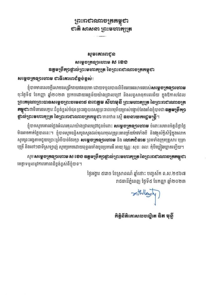 សារលិខិតថ្លែងអំណរគុណរបស់ ឯកឧត្តមកិត្តិនីតិកោសលបណ្ឌិត ឌិត មុន្ទី ផ្ញើជូន សម្តេចក្រឡាហោម ស ខេង ឧត្តមក្រុមប្រឹក្សាផ្ទាល់ព្រះមហាក្សត្រOne-Minuteអត្ថបទដោយ៖AMS OneMinute #ams1minute AMS OneMinuteអត្ថបទមុនអត្ថបទបន្ទាប់