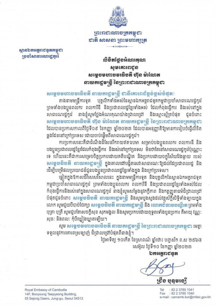 ស្ថានឯកអគ្គរាជទូតកម្ពុជាប្រចាំសាធារណរដ្ឋកូរ៉ ពលករ ពលការិនី និងប្រជាពលរដ្ឋទាំងអស់ដែលកំពុងធ្វើការ និងរស់នៅក្នុងសាធារណរដ្ឋកូរ៉េ បានថ្លែងអំណរគុណយ៉ាងជ្រាលជ្រៅ និងស្មោះស្ម័គ្របំផុត ជូនចំពោះសម្តេចមហាបវរធិបតី ហ៊ុន ម៉ាណែត នាយករដ្ឋមន្ត្រី នៃព្រះរាជាណាចក្រកម្ពុជា ដែលបានប្រកាសកាលពីថ្ងៃទី៩ ខែកញ្ញា ឆ្នាំ២០២៣ ដែលបានអនុញ្ញាតិឱ្យមានការរៀបចំធ្វើលិខិតឆ្លងដែននៅក្រៅប្រទេស ដោយចាប់ផ្តើមពីសាធារណរដ្ឋកូរ៉េ។ នេះបើយោងតាមលិខិតថ្លែងអំណរគុណចុះថ្ងៃទី១០ ខែកញ្ញា ឆ្នាំ២០២៣។