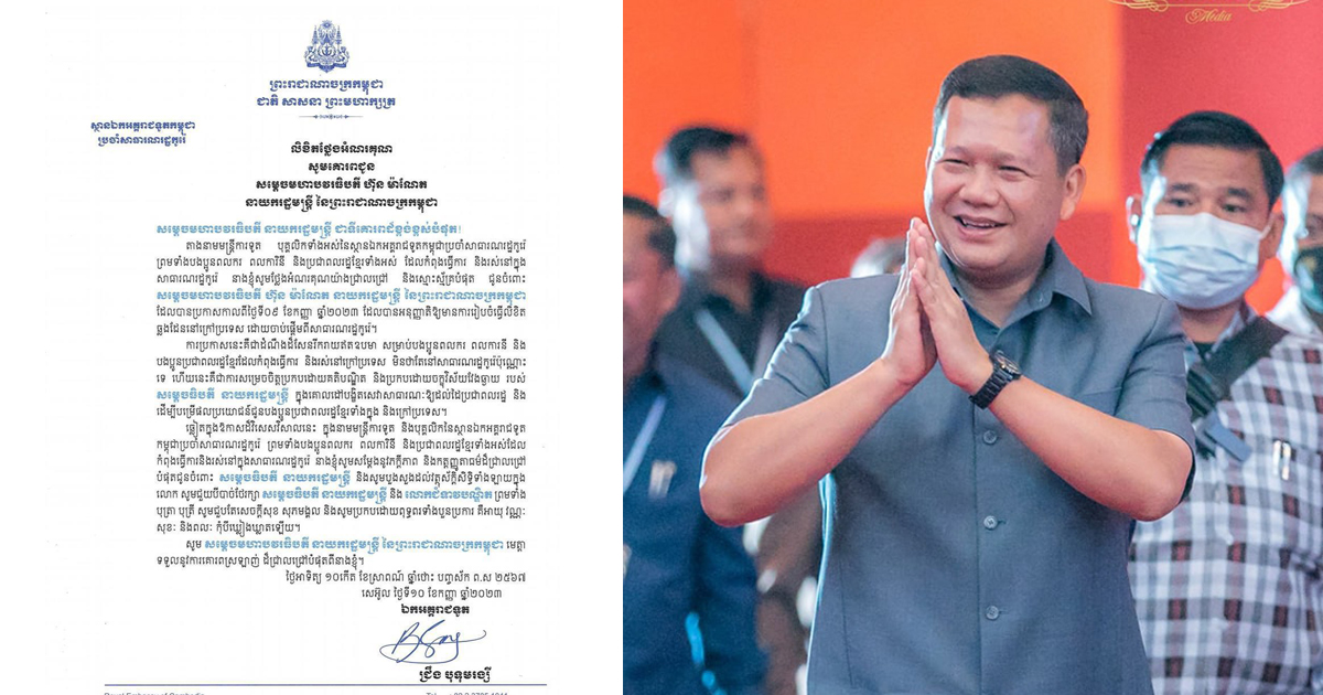 យោងតាមលិខិតថ្លែងអំណរគុណ សូមគោរពជូនសម្តេចមហាបវរធិបតី ហ៊ុន ម៉ាណែត នាយករដ្ឋមន្ត្រី នៃព្រះរាជាណាចក្រកម្ពុជាបានឱ្យដឹងថា តាងនាមមន្ត្រីការទូត បុគ្គលិកទាំងអស់នៃស្ថានឯកអគ្គរាជទូតកម្ពុជាប្រចាំសាធារណរដ្ឋកូរ៉ ព្រមទាំងពលករ ពលការិនី និងប្រជាពលរដ្ឋខ្មែរទាំងអស់ ដែលកំពុងធ្វើការ និងរស់នៅក្នុងសាធារណរដ្ឋកូរ៉េ សូមថ្លែងអំណរគុណយ៉ាងជ្រាលជ្រៅ និងស្មោះស្ម័គ្របំផុតជូនចំពោះសម្តេចមហាបវរធិបតី ហ៊ុន ម៉ាណែត នាយករដ្ឋមន្ត្រី នៃព្រះរាជាណាចក្រកម្ពុជា ដែលបានប្រកាសកាលពីថ្ងៃទី៩ ខែកញ្ញា ឆ្នាំ២០២៣ ដែលបានអនុញ្ញាតឱ្យមានការរៀបចំធ្វើលិខិតឆ្លងដែននៅក្រៅប្រទេស ដោយចាប់ផ្តើមពីសាធារណរដ្ឋកូរ៉េ។