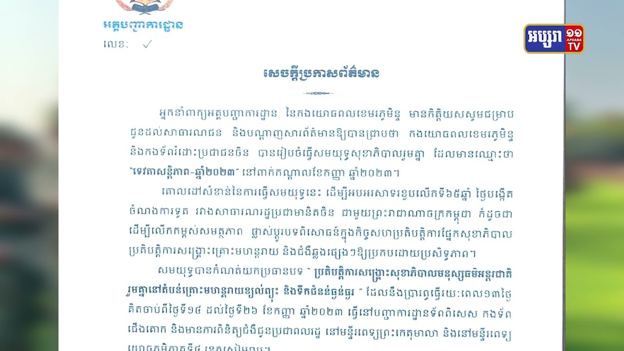 កងយោធពលខេមរភូមិន្ទរបស់ប្រទេសកម្ពុជា និងកងទ័ពរំដោះប្រជាជនចិន ត្រៀមនឹងរៀបចំធ្វើសមយុទ្ធសុខាភិបាលរួមគ្នាមួយ ក្នុងសប្តាហ៍នេះ នៅលើទឹកដីកម្ពុជា។សមយុទ្ធសុខាភិបាល ដែលមានឈ្មោះថា «ទេវតាសន្តិភាពឆ្នាំ២០២៣» នឹងប្រព្រឹត្តទៅរវាងពីថ្ងៃទី១៤ ដល់២៦កញ្ញា ដែលនឹងមានរយៈពេល១៣ថ្ងៃ នៅបញ្ជាការដ្ឋានកងទ័ពពិសេស កងទ័ពជើងគោក។ អប្សរាណិតធ្វើសេចក្តីរាយការណ៍