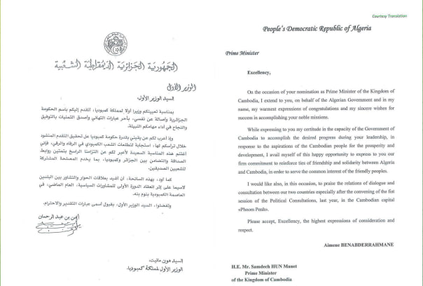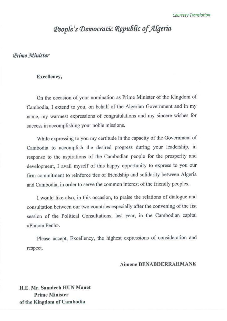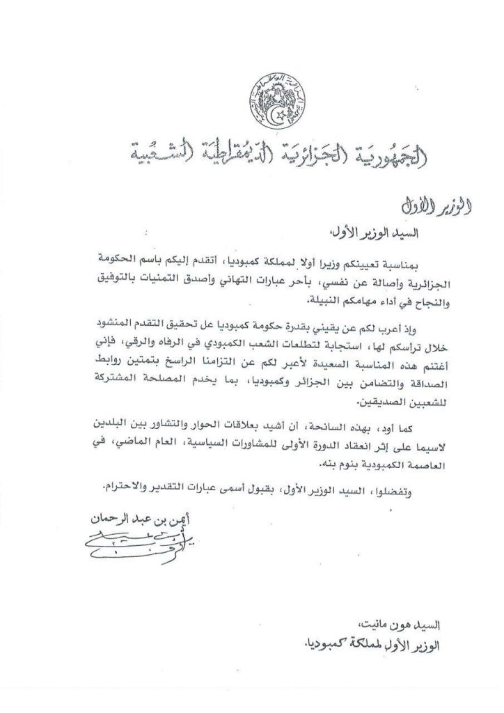 បានផ្ញើសារលិខិតអបអរសាទរជូន ឯកឧត្តមកិត្តិទេសាភិបាលបណ្ឌិត ហ៊ុន ម៉ាណែត សម្រាប់ការចូលកាន់តំណែងជា នាយករដ្ឋមន្ត្រីថ្មីរបស់កម្ពុជា 🇰🇭🇩🇿