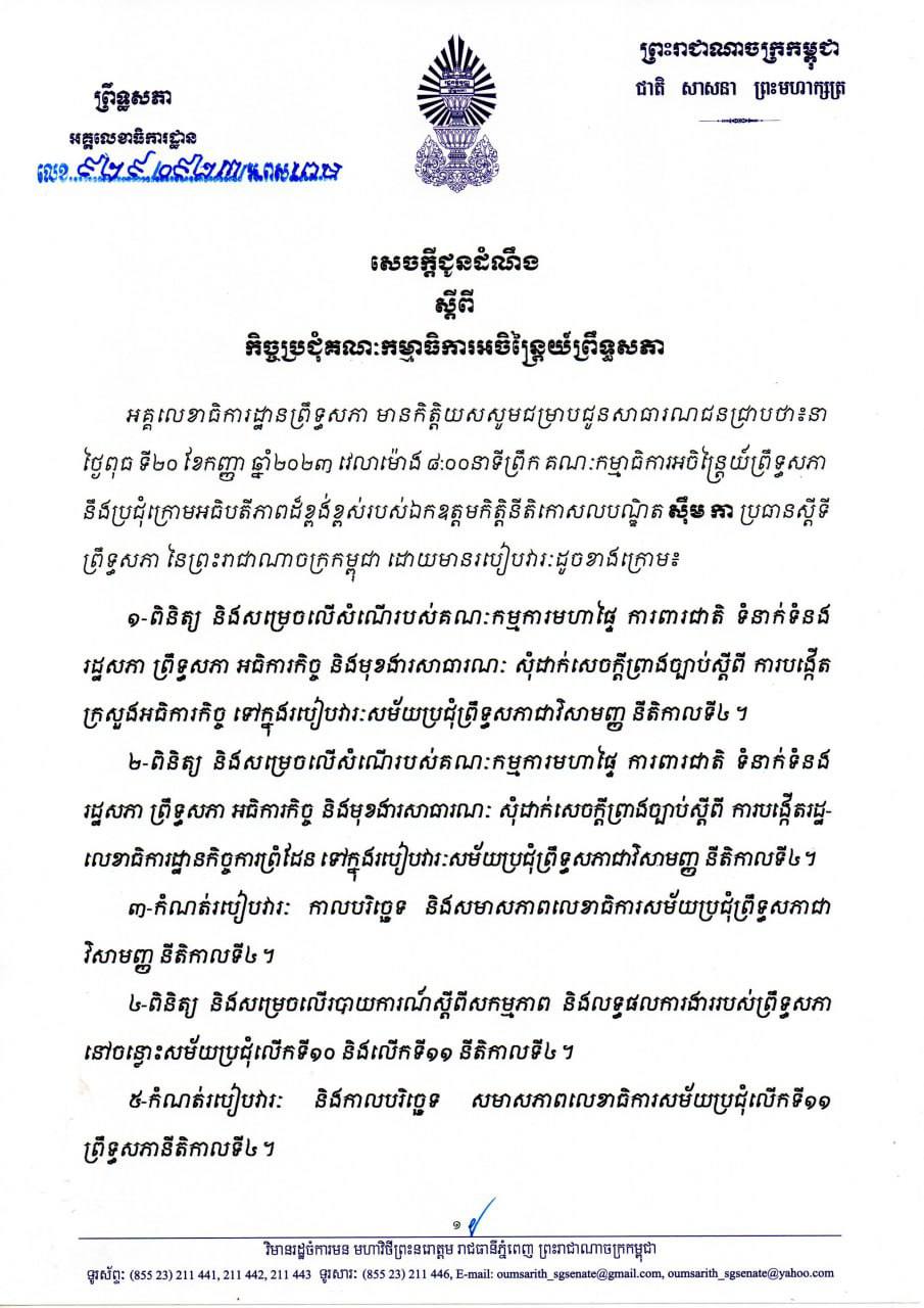 ភ្នំពេញ៖ គណៈកម្មាធិការអចិន្ត្រៃយ៍ព្រឹទ្ធសភា នឹងប្រជុំក្រោមអធិបតីភាពដ៏ខ្ពង់ខ្ពស់របស់ឯកឧត្តមកិត្តិនីតិកោសលបណ្ឌិត ស៊ឹម កា ប្រធានស្ដីទី ព្រឹទ្ធសភា នៃព្រះរាជាណាចក្រកម្ពុជា នៅព្រឹកថ្ងៃទី២០ ខែកញ្ញា ឆ្នាំ២០២៣។