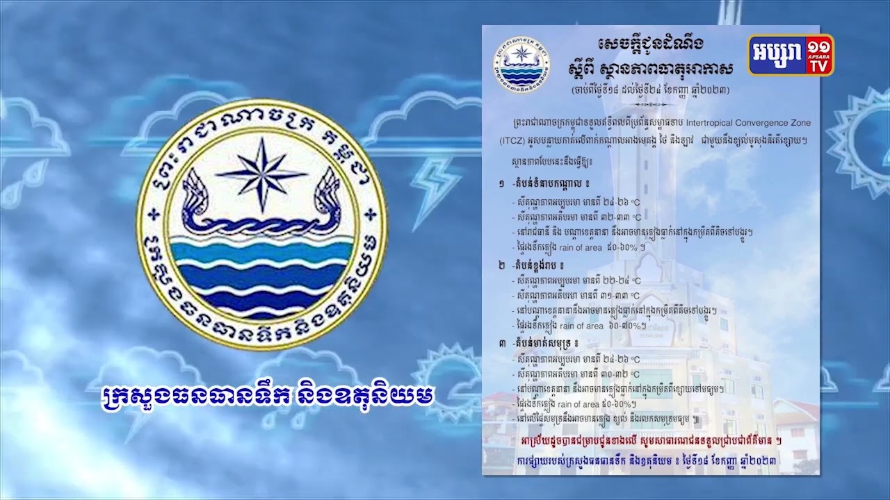 កម្ពុជាក្នុងសប្តាហ៍នេះ នៅតែមានភ្លៀងពីកម្រិតខ្សោយទៅបង្គួរ ដោយសារការរងឥទ្ធិពលប្រព័ន្ធសម្ពាធទាប ITCZ ។ ការព្យាករណ៍បង្ហាញថាចំណែកសីតុណ្ហភាពកម្តៅ ក៏បានកើនឡើង ១អង្សាសេផងដែរ បើប្រៀបធៀបនឹងសប្តាហ៍មុន។ អប្សរាណិតធ្វើសេចក្តីរាយការណ៍