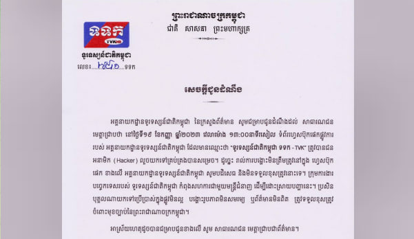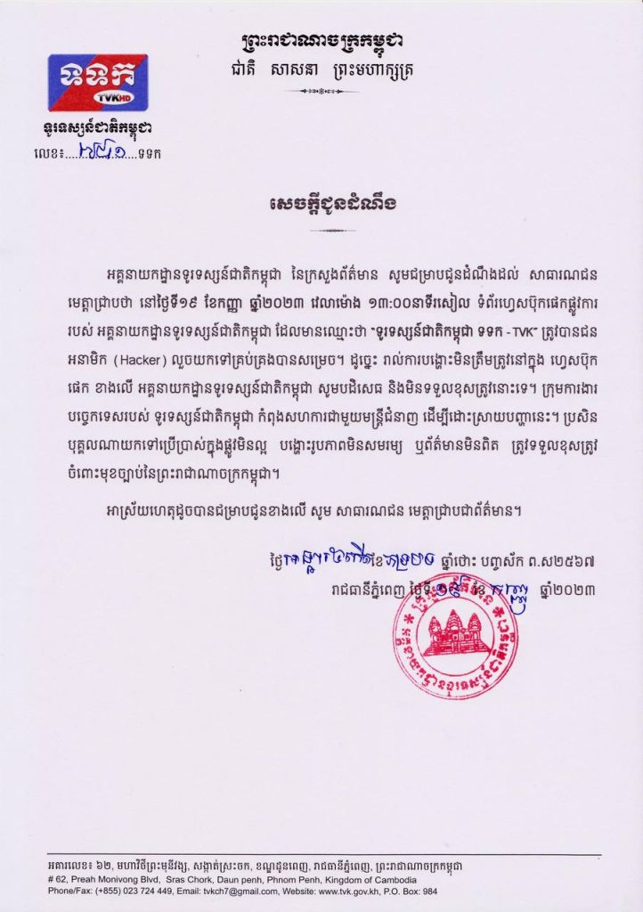 ទំព័រហ្វេសប៊ុកផេកផ្លូវការ មានឈ្មោះថា “ទូរទស្សន៍ជាតិកម្ពុជា ទទក -TVK” ត្រូវបានជនអនាមិក (Hacker) លួចយកទៅគ្រប់គ្រងOne-Minuteអត្ថបទដោយ៖AMS OneMinute ១៩ កញ្ញា ២០២៣ #ams1minute AMS OneMinuteអត្ថបទមុនអត្ថបទបន្ទាប់