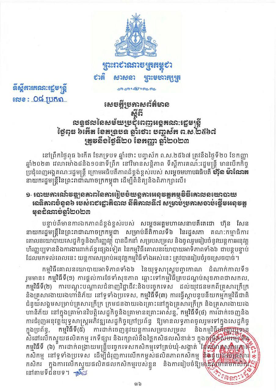 សេចក្ដីប្រកាសព័ត៌មាន ស្ដីពី លទ្ធផលសម័យប្រជុំពេញអង្គគណៈរដ្ឋមន្ត្រី ថ្ងៃទី២០ ខែកញ្ញា ឆ្នាំ២០២៣