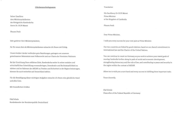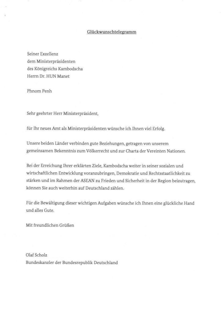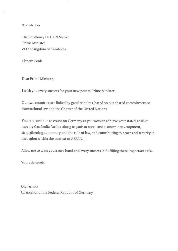 លោក Olaf Scholz អធិការបតីនៃសាធារណរដ្ឋសហព័ន្ធអាល្លឺម៉ង់ បានផ្ញើសារលិខិតអបអរសាទរជូន ឯកឧត្តមកិត្តិទេសាភិបាលបណ្ឌិត ហ៊ុន ម៉ាណែត