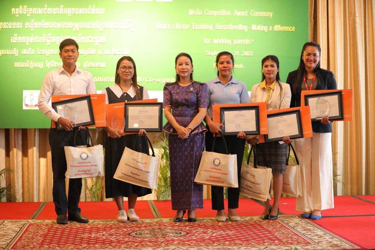 ភ្នំពេញ៖ បេក្ខជនជាអ្នកសាព័ត៌មានចំនួនប្រាំរូបដែលមកពីចម្រុះស្ថាប័ន បានទទួលជ័យលាភីពីកម្មវិធីប្រកួតសរសេរអត្ថបទព័ត៌មាន និងបទយកការណ៍ស្តីពីការបង្កើតបរិយាកាសងាយស្រួលនៅកន្លែងការងារដើម្បីលើកម្ពស់ការចិញ្ចឹមកូនដោយទឹកដោះម្តាយនៅកម្ពុជា ។កម្មវិធីប្រកាសជ័យលាភី និងប្រគល់រង្វាន់ត្រូវបានប្រារព្ធឡើងកាលពីថ្ងៃទី២១ ខែកញ្ញា ឆ្នាំ២០២៣ ក្រោមអធិបតីភាពលោកជំទាវ ប្រាក់ សោភ័ណនារី រដ្ឋលេខាធិការក្រសួងសុខាភិបាល។