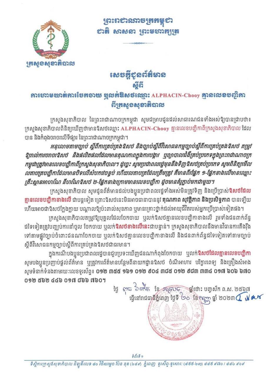 ក្រសួងសុខាភិបាល ចេញសេចក្តីជូនព័ត៌មាន ស្តីពីការហាមឃាត់ការចែកចាយ ឬលក់ឱសថ ALPHACIN-Chooy គ្មានលេខបញ្ជិកាពីក្រសួងសុខាភិបាល