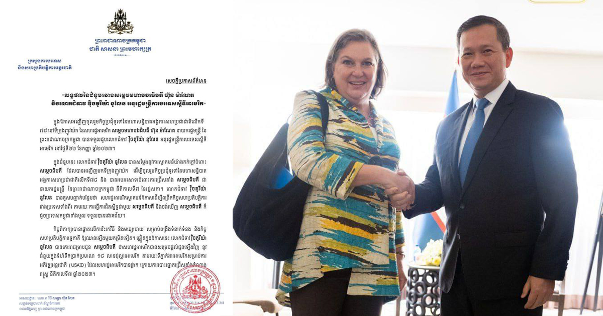 ក្នុងឱកាសអញ្ជើញចូលរួមកិច្ចប្រជុំទូទៅនៃមហាសន្និបាតអង្គការសហប្រជាជាតិលើកទី៧៨ នៅទីក្រុងញូវយ៉ក នៃសហរដ្ឋអាមេរិក សម្ដេចមហាបវរធិបតី ហ៊ុន ម៉ាណែត នាយករដ្ឋមន្ត្រី នៃព្រះរាជាណាចក្រកម្ពុជា បានទទួលជួបលោកជំទាវ វ៉ិចតូរីយ៉ា នូលែន អនុរដ្ឋមន្ត្រីការបរទេសស្ដីទីអាមេរិក នៅថ្ងៃទី២២ ខែកញ្ញា ឆ្នាំ២០២៣។