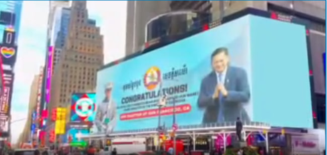 ផ្ទាំងប៉ាណូនៅចំកណ្តាលទីក្រុងញូយ៉ក តំបន់ Times Square ស្វាគមន៍វត្តមាន សម្តេចធិបតី ហ៊ុន ម៉ាណែត
