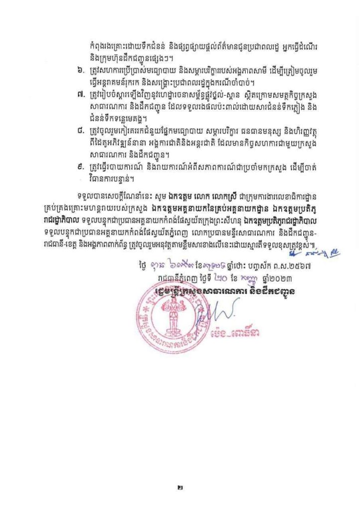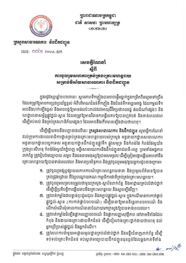 ក្រសួងសាធារណការ ចេញសេចក្ដីណែនាំ អោយចូលរួមសហការគ្រប់គ្រងគ្រោះមហន្តរាយ សម្រាប់វិស័យសាធារណការ និងដឹកជញ្ជូន