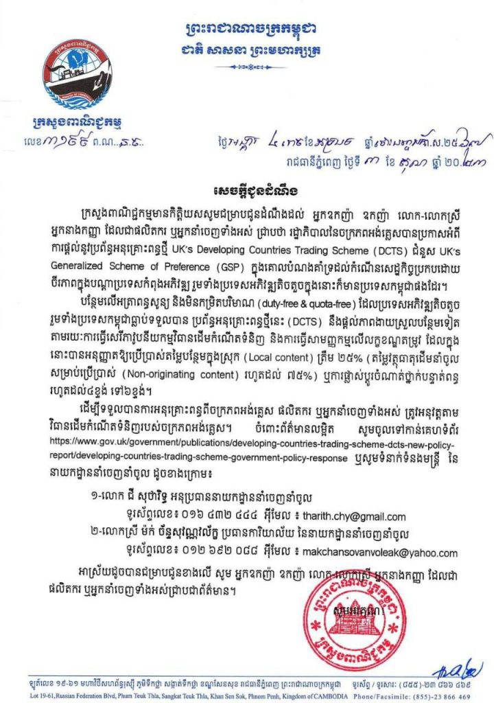 តាមសេចក្តីជូនដំណឹងរបស់ក្រសួងពាណិជ្ជកម្ម ដែលបានចេញផ្សាយកាលពីល្ងាចថ្ងៃទី ៣ ខែតុលា ឆ្នាំ២០២៣ បានឱ្យដឹ ងថា រដ្ឋាភិបាលនៃចក្រភពអង់គ្លេសបានប្រកាសអំពីការផ្តល់នូវប្រព័ន្ធអនុគ្រោះពន្ធថ្មី UK’s Developing Countries Trading Scheme (DCTS) ជំនួស UK’s Generalized Scheme of Preference (GSP) ក្នុងគោលបំណងគាំទ្រដល់កំណើនសេដ្ឋកិច្ចប្រកបដោយ ចីរភាពក្នុងបណ្ដាប្រទេសកំពុងអភិវឌ្ឍ រួមទាំងប្រទេសអភិវឌ្ឍតិចតួចក្នុងនោះក៏មានប្រទេសកម្ពុជាផងដែរ។