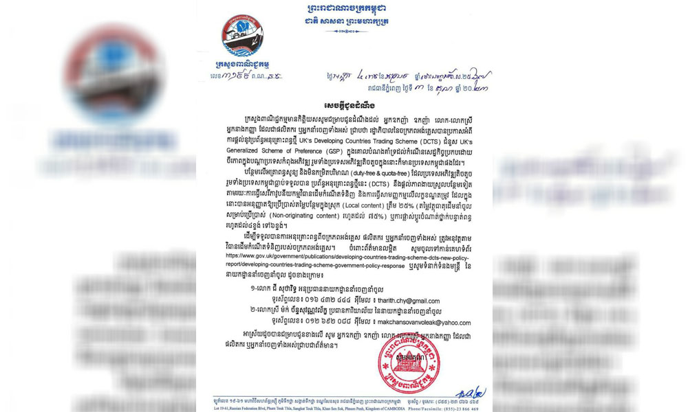 ភ្នំពេញ: ក្រសួងពាណិជ្ជកម្ម បានជំរុញឱ្យផលិតករ ឬអ្នកនាំចេញអនុវត្តតាមវិធានដើមកំណើតទំនិញ របស់ចក្រភពអង់គ្លេសដើម្បីទទួលបានការអនុគ្រោះពន្ធ ក្រោមប្រព័ន្ធអនុគ្រោះពន្ធថ្មី UK’s Developing Countries Trading Scheme (DCTS) ទៅ ទីផ្សារអង់គ្លេស។