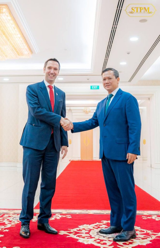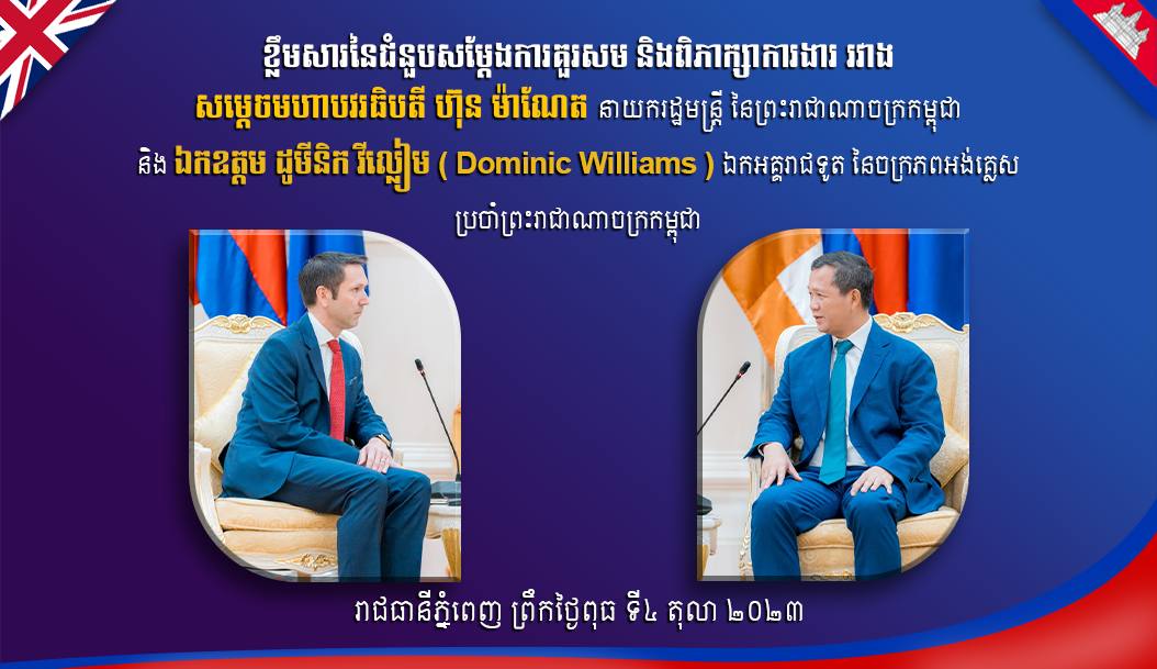 (ភ្នំពេញ)៖ ក្នុងជំនួបពិភាក្សាការងារជាមួយ ឯកឧត្តម ដូមីនិច វីល្លៀម (Dominic Williams) ឯកអគ្គរាជទូត នៃចក្រភពអង់គ្លេស ប្រចាំនៅកម្ពុជា នាព្រឹកថ្ងៃទី៤ ខែតុលា ឆ្នាំ២០២៣ នៅវិមានសន្តិភាព សម្តេចមហាបវរធិបតី ហ៊ុន ម៉ាណែត នាយករដ្ឋមន្រ្តី នៃ កម្ពុជា បានបញ្ជាក់ថា ទោះបីកម្ពុជា មានរាជរដ្ឋាភិបាលថ្មី ប៉ុន្តែគោលនយោបាយការបរទេស ជាពិសេសក្នុងទំនាក់ទំនងរវាងកម្ពុជា-អង់គ្លេស គឺមិនប្រែប្រួល ។