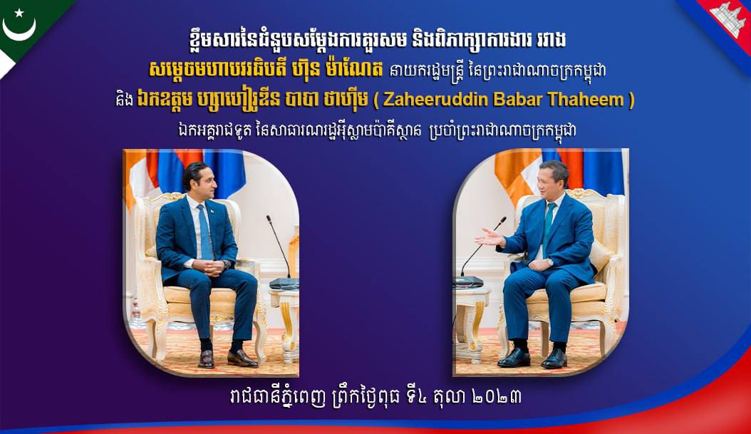 ការឯកភាពរបស់សម្តេចមហាបវរធិបតី ហ៊ុន ម៉ាណែត នាយករដ្ឋមន្រ្តី នៃ កម្ពុជា ក្នុងជំនួបពិភាក្សាការងាជាមួយ ឯកឧត្តម ហ្សាហៀរូឌីន បាបា ថាហ៊ីម (Zaheeruddin Babar Thaheem) ឯកអគ្គរដ្ឋទូត នៃសាធារណរដ្ឋអ៊ីស្លាមប៉ាគីស្ថាន ប្រចាំនៅកម្ពុជា នាព្រឹកថ្ងៃទី៤ ខែតុលា ឆ្នាំ២០២៣ នៅវិមានសន្តិភាព ។